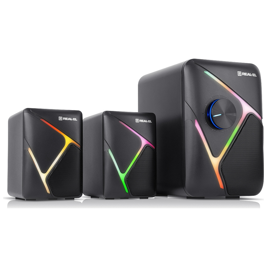 REAL-EL M-320 має яскраве RGB підсвічування, яке додає стилю та створює незабутню атмосферу під час прослуховування. Регулятор гучності з підсвічуванням розташований на передній панелі сабвуфера, що дозволяє швидко та легко налаштувати звук під ваші потреби.