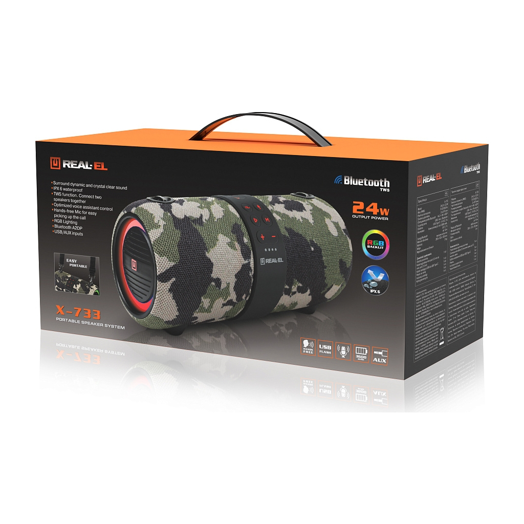 Мультимедійна портативна акустична система REAL-EL X-733 поєднує сучасний дизайн і якісне звучання.