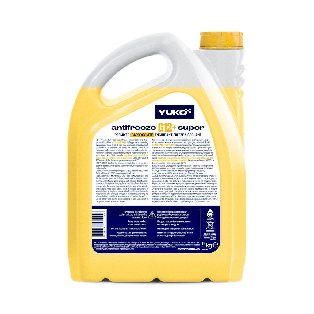 Антифриз Yuko -32 Super G12+ жовтий – це високоякісний охолоджуючий рідкий засіб, призначений для захисту двигунів автомобілів від замерзання при низьких температурах. Завдяки своїй формулі на основі моноетиленгліколю, цей антифриз забезпечує надійний захист від корозії та перегріву, що робить його ідеальним вибором для експлуатації в холодних умовах.