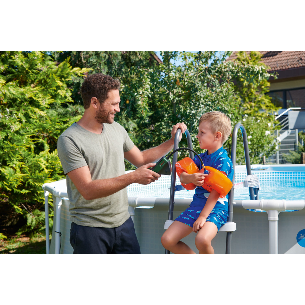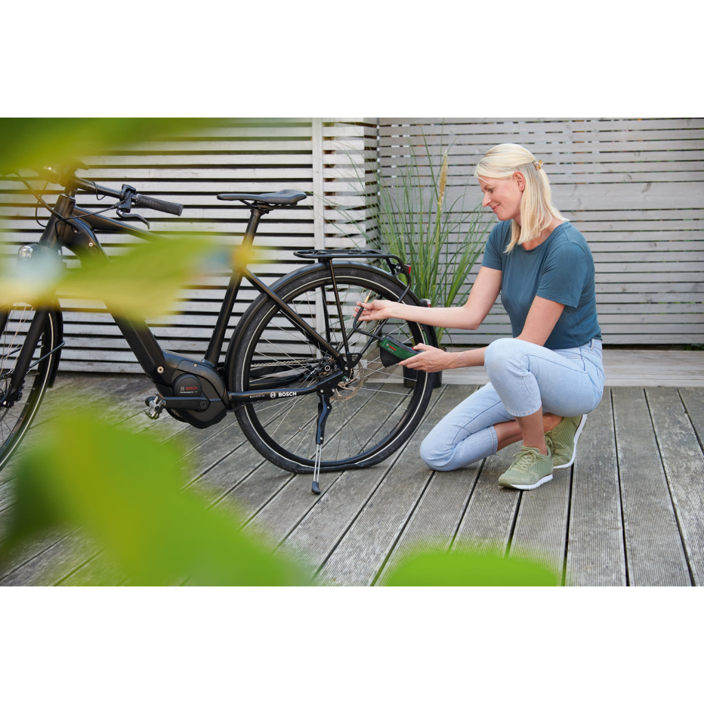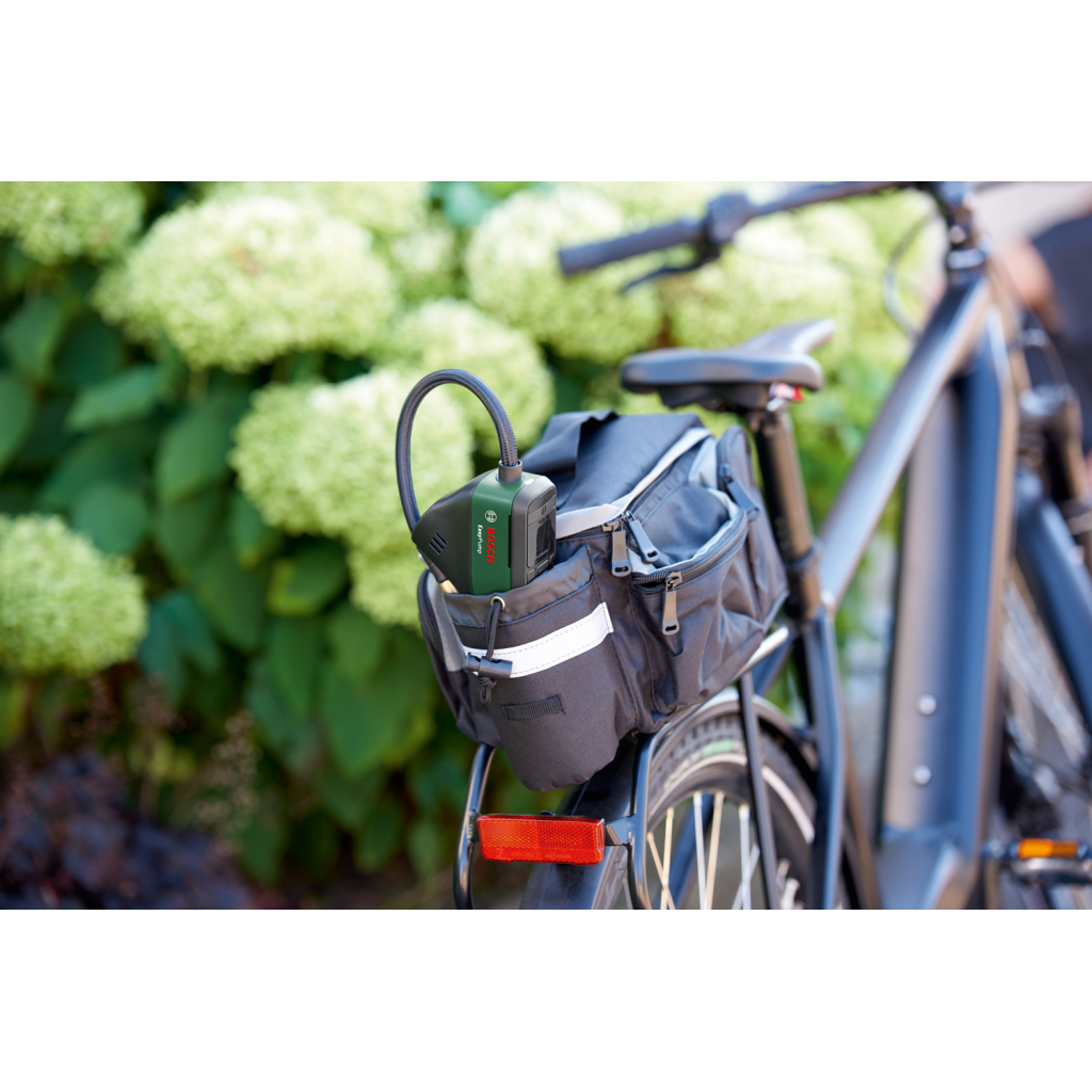 Основні технічні характеристики компресора Bosch EasyPump: модель – 3.6V, 3Ah, вага – 0.4 кг, тип живлення – зовнішній акумулятор з напругою 5 В. Пристрій оснащений цифровим манометром, що дозволяє точно контролювати тиск. Довжина шланга складає 1 м, а довжина проводу живлення – 24 см, що забезпечує зручність у використанні.