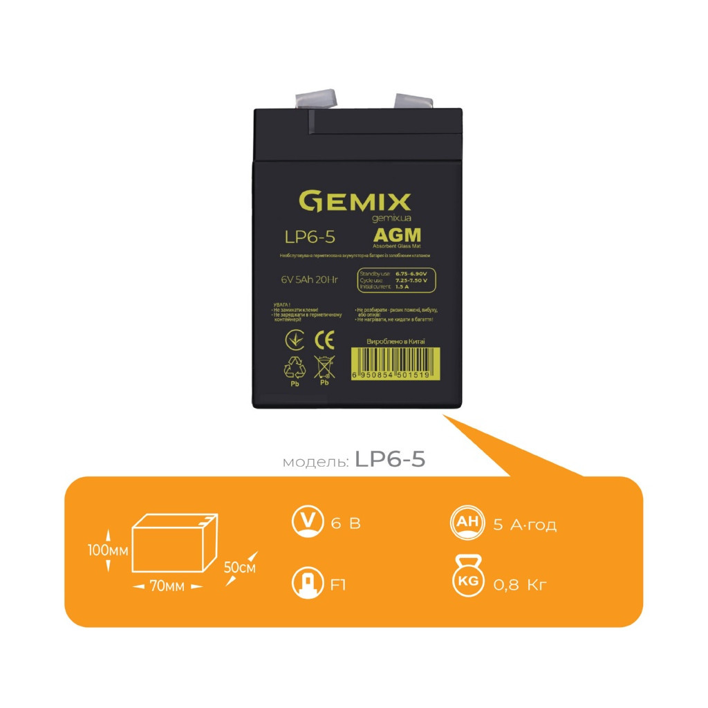 Ця батарея має універсальне призначення, що робить її ідеальним вибором для різних застосувань. Завдяки розмірам 70х50х100 мм та вазі всього 0.8 кг, вона легко інтегрується в будь-які системи. Клеми типу F1 забезпечують зручність підключення, а надійна конструкція гарантує тривалий термін служби. Обираючи батарею Gemix 6В 5Ач, ви отримуєте якісний продукт, що відповідає всім сучасним вимогам.