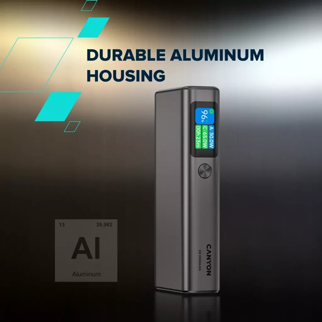 Серед особливостей Canyon OnPower 230 варто відзначити цифровий дисплей, що відображає стан заряду, а також підтримку технологій Power Delivery та Quick Charge 3.0 для максимально швидкого заряджання. Корпус виготовлений з металу, що забезпечує додаткову міцність та надійність. Обирайте Canyon 20000mAh для зручності та впевненості у вашій мобільності.
