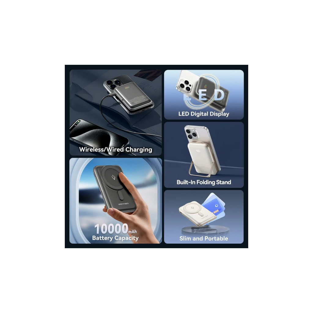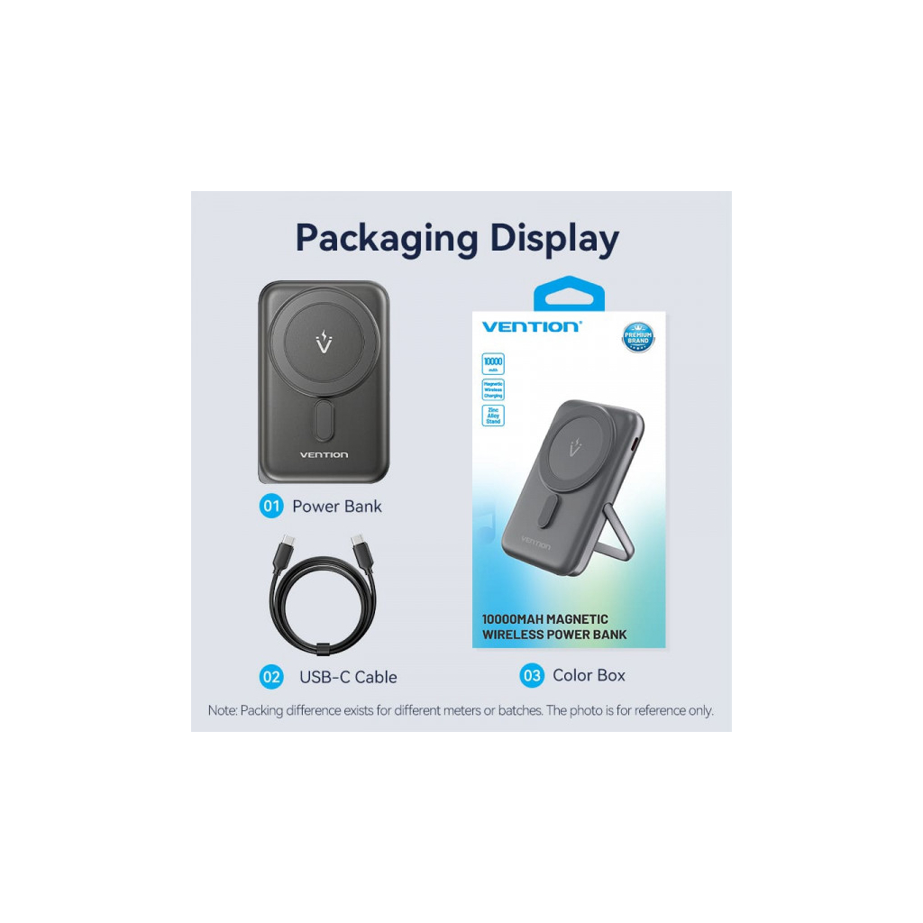 Універсальна мобільна батарея Vention Magnetic Wireless 10000mAh 20W PD швидко та безпечно поповнить заряд пристроїв, сумісних зі стандартом Qi. Магнітна зарядна пластина надійно фіксує смартфони з силою 12N навіть у чохлі. Максимальна потужність бездротового заряджання становить 15 Вт. Також у вашому розпорядженні порт USB Type-C з вихідною потужністю до 20 Вт. Використовуйте його для поповнення заряду самої батареї з потужністю до 18 Вт.