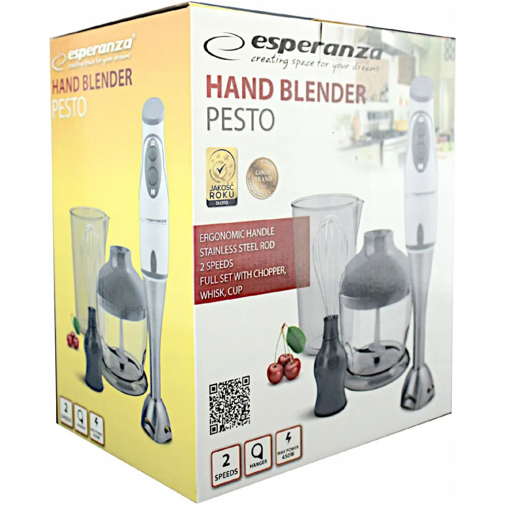 Esperanza Pesto EKM003E – це надійний міксер-блендер, який стане справжнім помічником на Вашій кухні. Міксер має дві швидкості, які допоможуть досягти кращого результату при збиванні або подрібненні продуктів. Міксер – блендер має потужність 450 Вт, що дозволяє йому повноцінно збивати або подрібнювати продукти. Є режим турбо. Об’єм робочої чаші 750 мл, що дозволяє повноцінно працювати з продуктами та готувати страви для всієї родини.