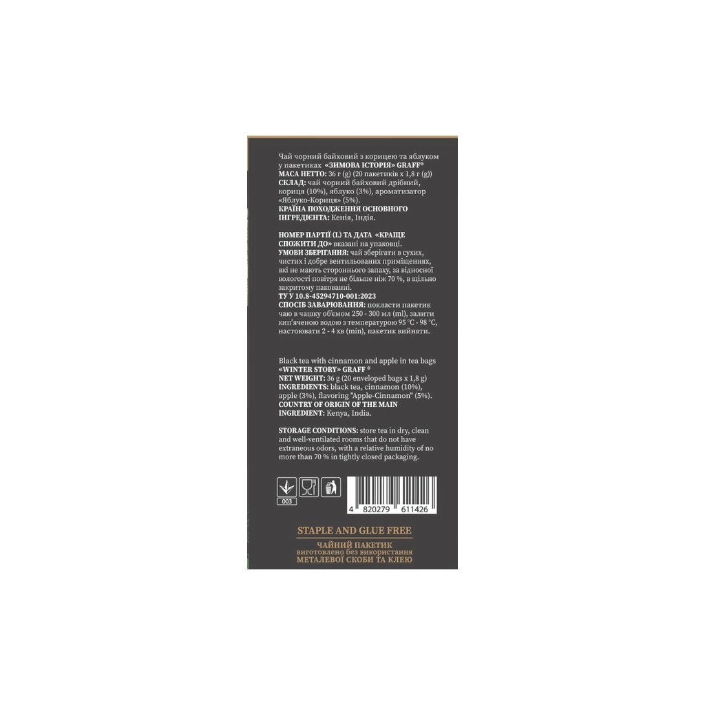 Чай Graff Winter Story не лише смачний, але й корисний. Завдяки натуральним інгредієнтам, він може стати частиною здорового способу життя. Пакування у картонній коробці забезпечує зручність зберігання, а термін зберігання – 36 місяців, дозволяє насолоджуватись улюбленим напоєм протягом тривалого часу. Оберіть Graff Winter Story та насолоджуйтесь смаком зими в кожній чашці!