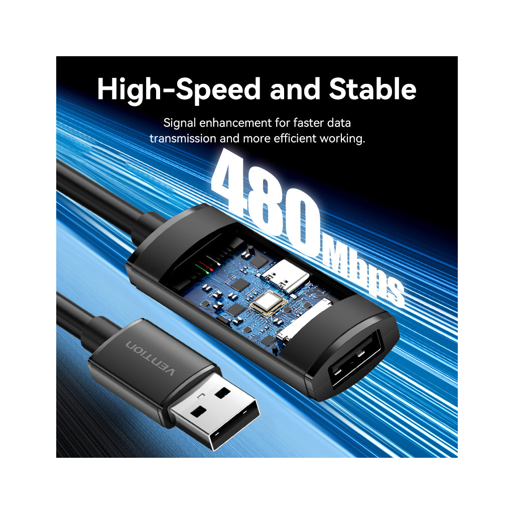 Активний подовжувач Vention довжиною 15 метрів USB 2.0 Type-A (тато) на Type-A (мама) з підсилювачем сигналу та додатковим живленням USB-C, чорного кольору, є ідеальним рішенням для тих, хто потребує надійного з’єднання на великій відстані. Завдяки вбудованій електроніці, цей кабель забезпечує стабільну передачу даних без втрати якості сигналу. Ключові особливості: