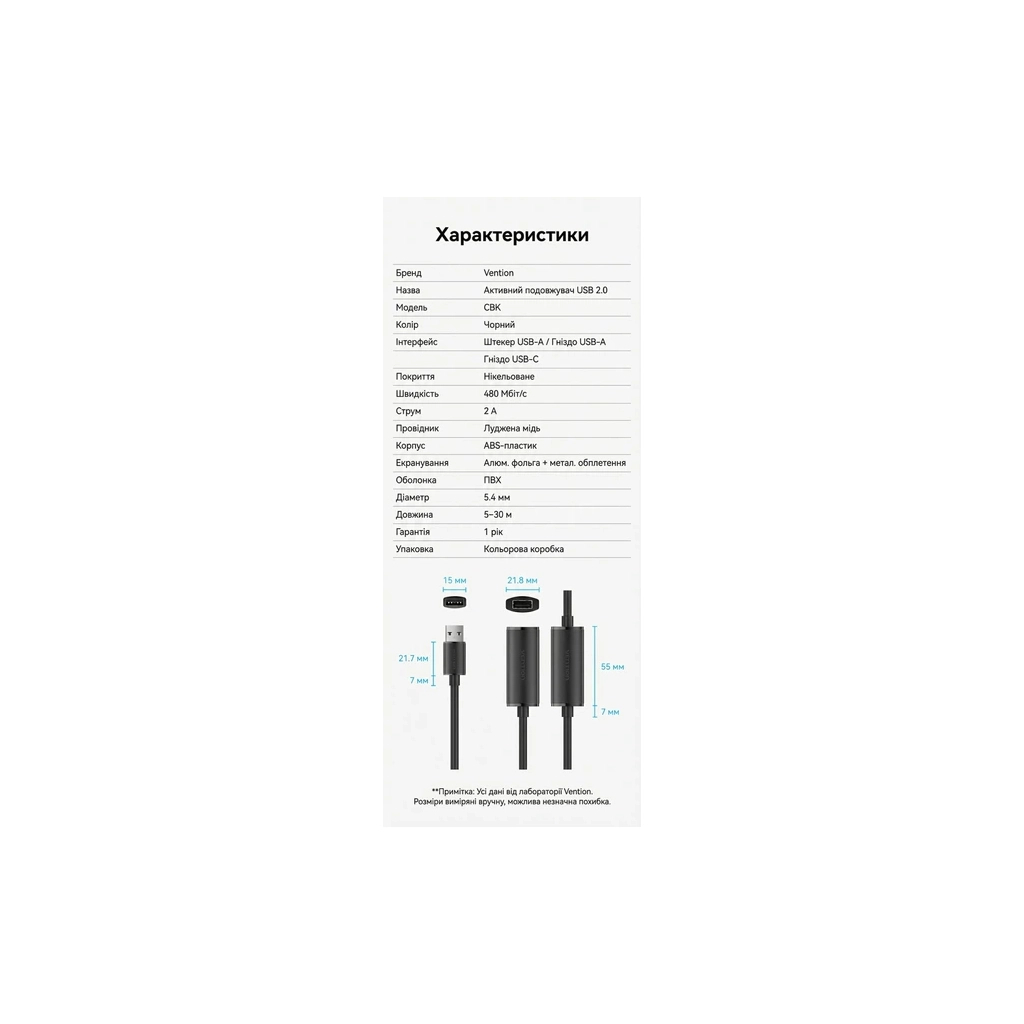Обов’язкова примітка: для забезпечення безперебійної роботи підключеного обладнання на відстані 20 метрів, користувач повинен враховувати енергоспоживання своїх пристроїв. Якщо ви плануєте використовувати цей подовжувач з технікою, яка споживає струм понад 0,5 А, необхідно підключити додаткове зовнішнє живлення через вбудований роз’єм USB-C.