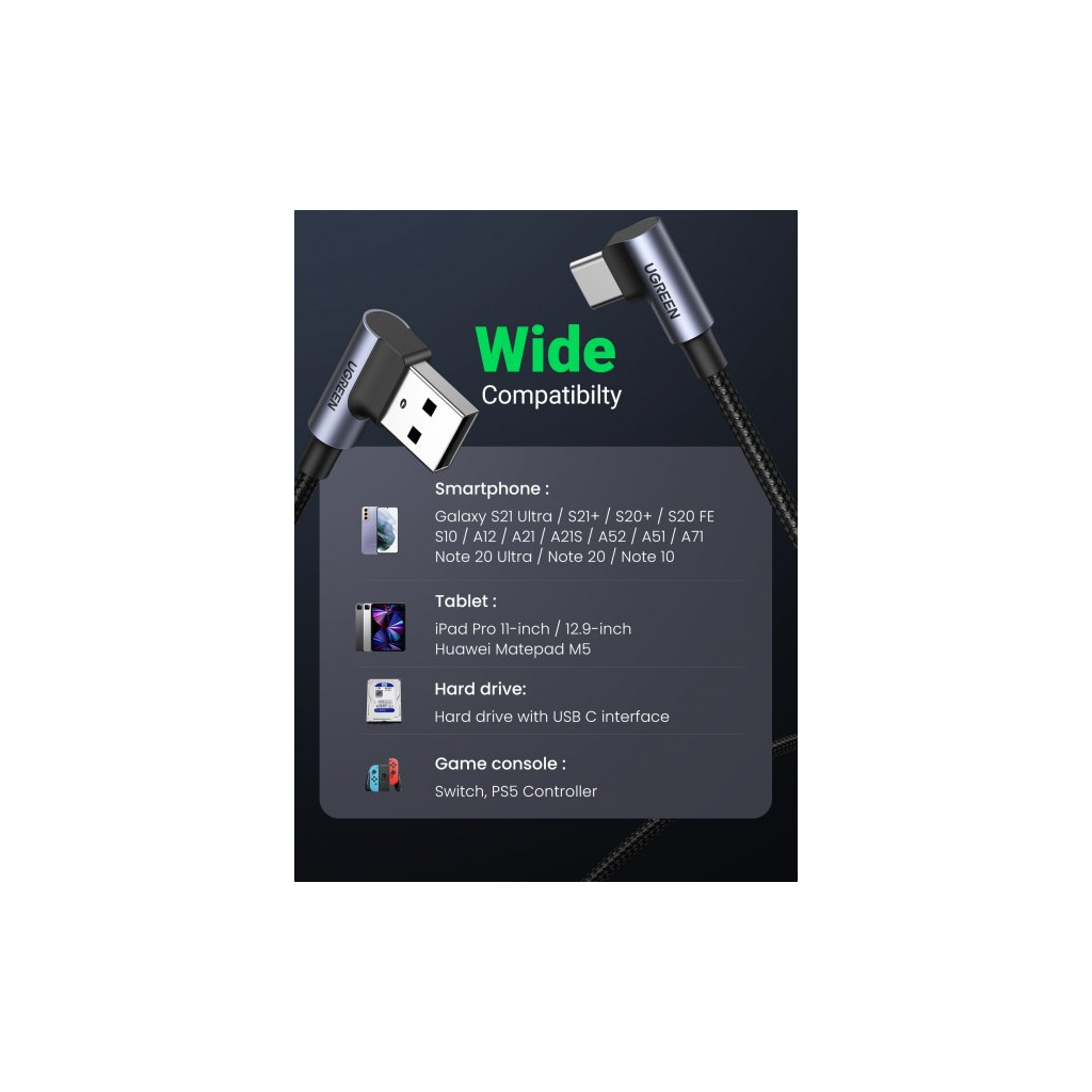 Ugreen Дата кабель USB 2.0 AM to Type-C 1.0m US176 Both Angled 3A (Black) – це надійний та зручний кабель, призначений для швидкої передачі даних та зарядки ваших пристроїв. Завдяки інноваційному дизайну з 90° поворотом конектора, він ідеально підходить для використання в обмежених просторах, забезпечуючи комфорт та зручність.