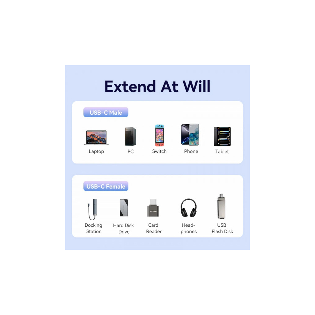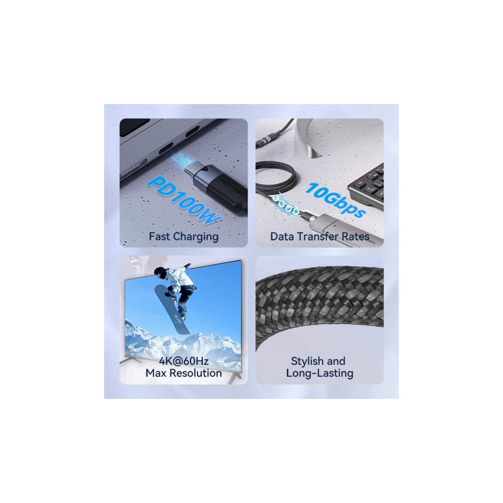Кабель USB-C M/F від Vention – це надійний та швидкісний аксесуар, який забезпечує високу продуктивність при передачі даних та зарядці. Довжина кабелю складає 1 метр, що робить його ідеальним для використання в офісі або вдома. Завдяки потужності 100W, ви зможете швидко заряджати свої пристрої, а підтримка 4K60Hz дозволяє передавати відео в найвищій якості. Кабель підтримує швидкість передачі даних до 10Gbps, що робить його ідеальним для роботи з великими файлами.