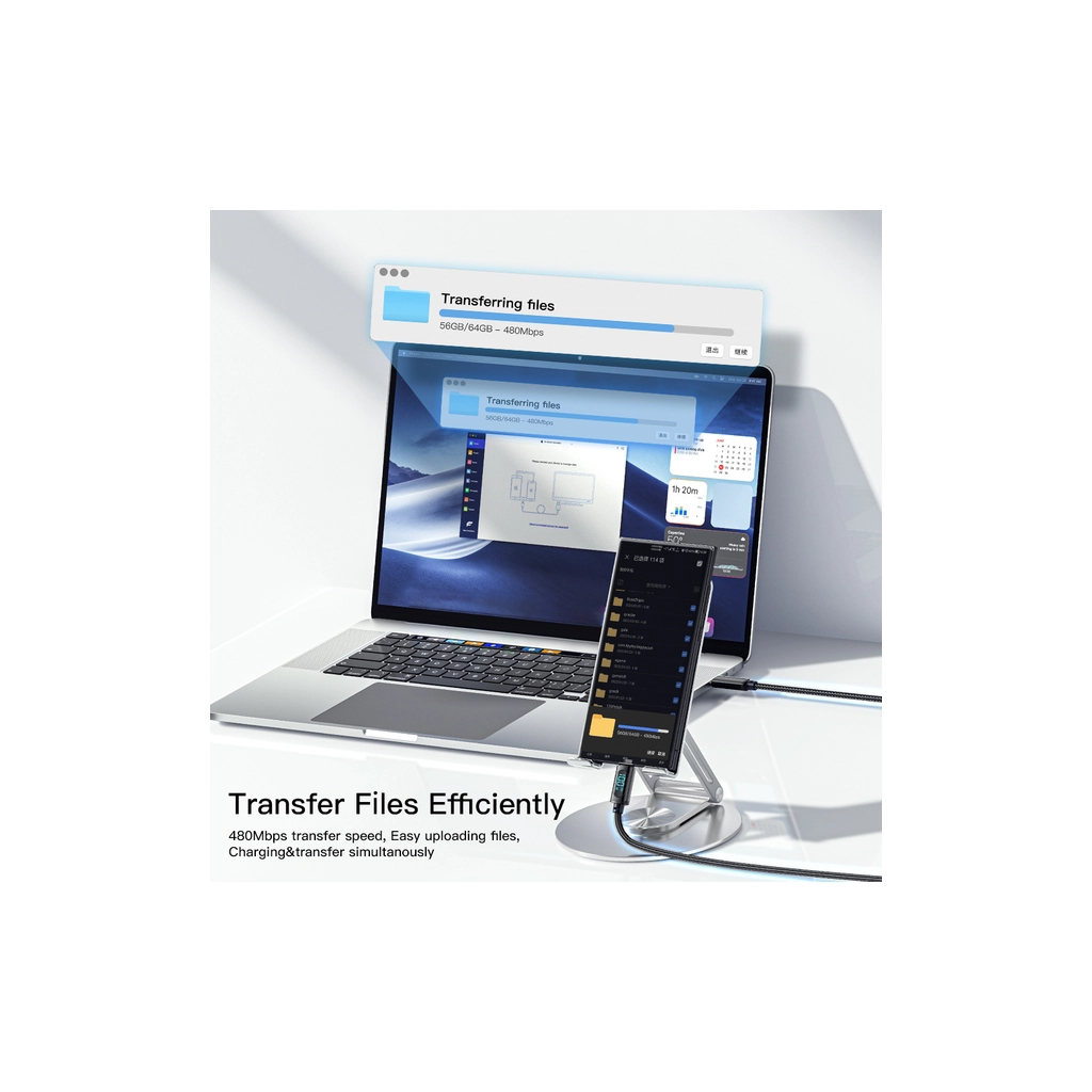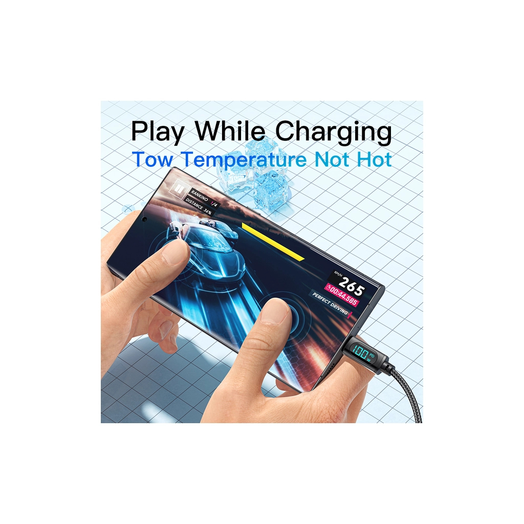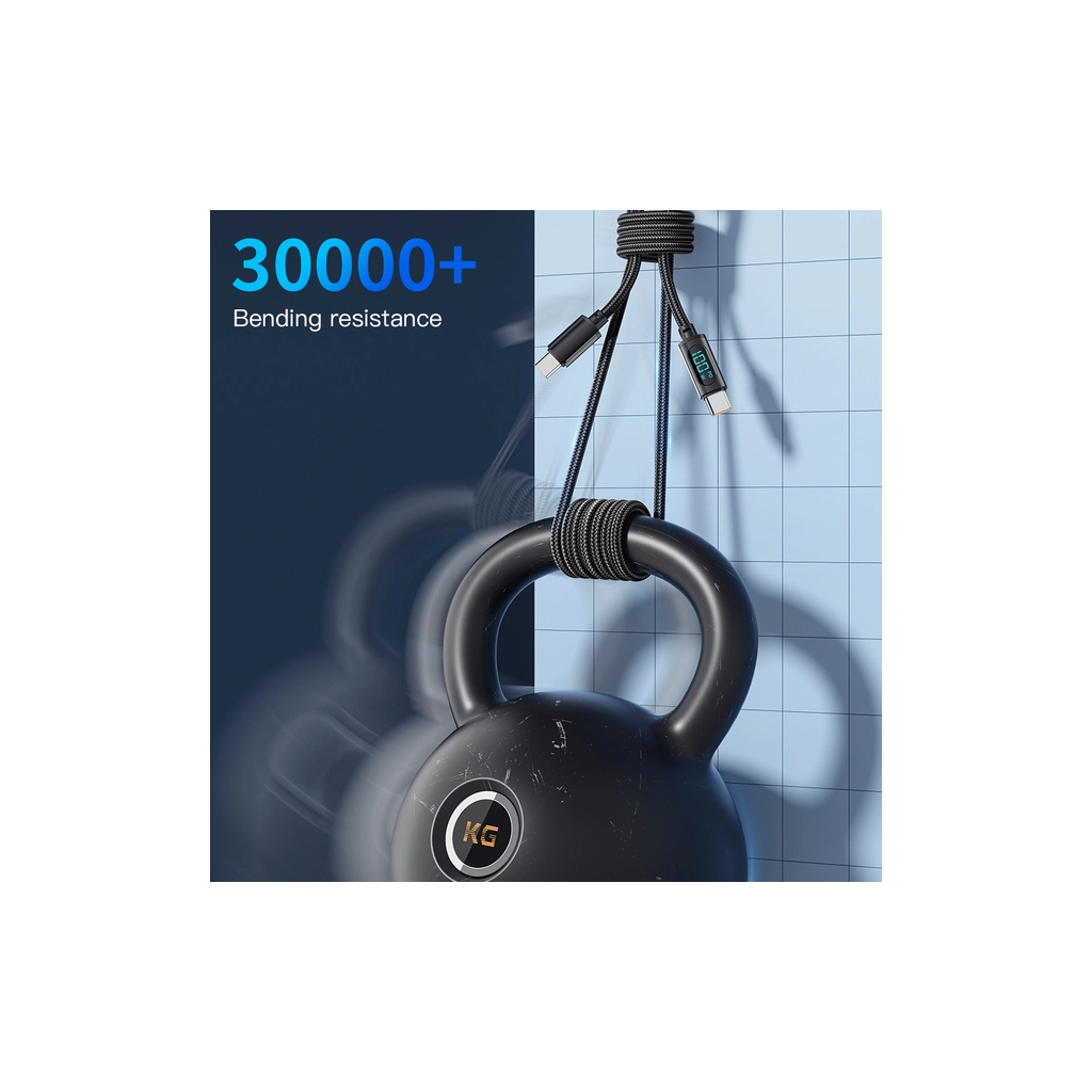 Кабель має тканинне обплетення, що забезпечує додаткову міцність і захист від пошкоджень. Цифровий дисплей дозволяє контролювати споживану потужність, що робить використання кабелю ще більш зручним. Вироблено в Китаї, цей кабель поєднує в собі стильний дизайн та високу продуктивність, що робить його відмінним вибором для сучасних користувачів.