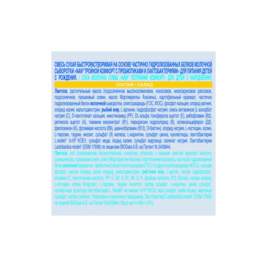 Дитяча суміш Nestle NAN Потрійний комфорт з народження, 400 г – це ідеальний вибір для здорового харчування вашої дитини з перших днів життя. Спеціально розроблена формула забезпечує оптимальне харчування для дітей віком від 0 до 6 місяців, сприяючи здоровому розвитку та запобіганню кольок.