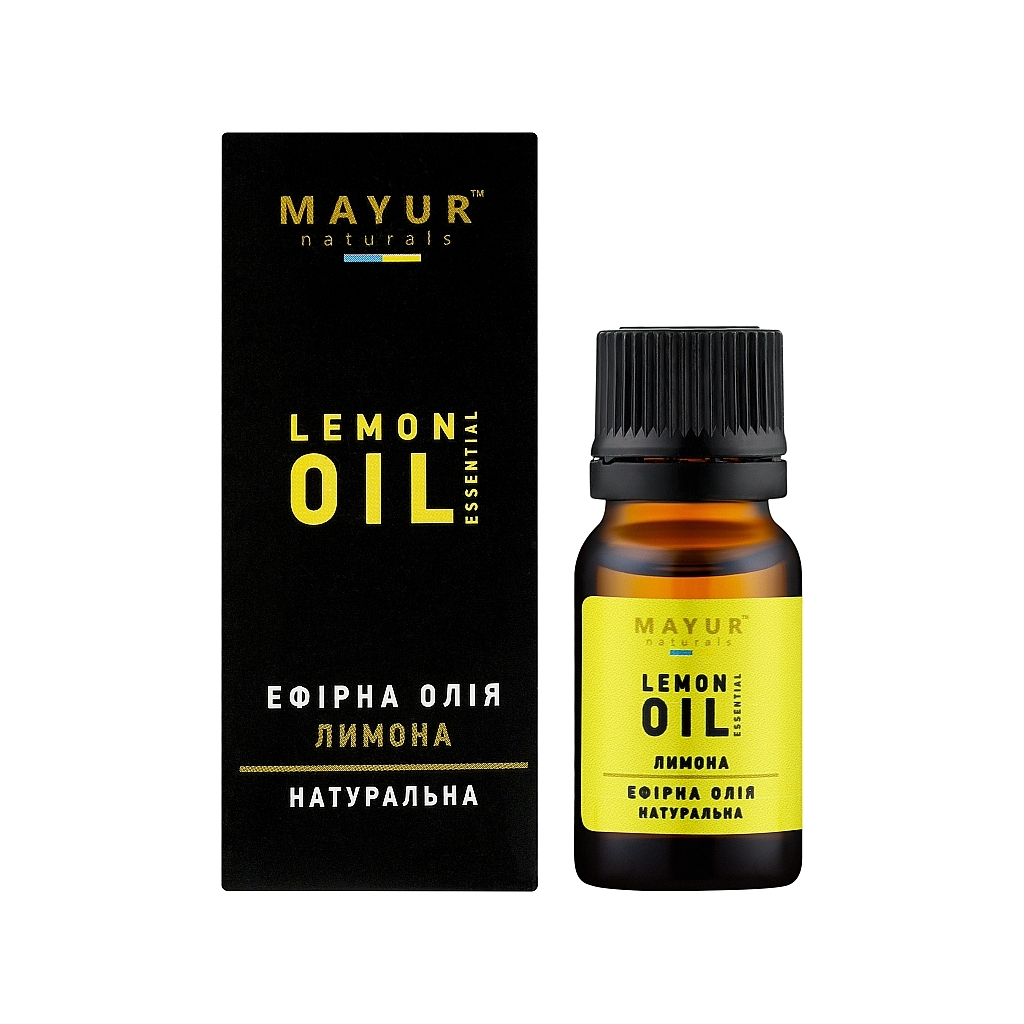 Ефірна олія Mayur Лимона 10 мл – це 100% натуральна ефірна олія преміум якості, яка має безліч корисних властивостей. Сприятливо впливає на організм, підтримуючи здоров’я та красу шкіри, нігтів і волосся. Використовується для збагачення косметичних препаратів, масажу, ванн, а також для інгаляцій і ароматизації приміщень.