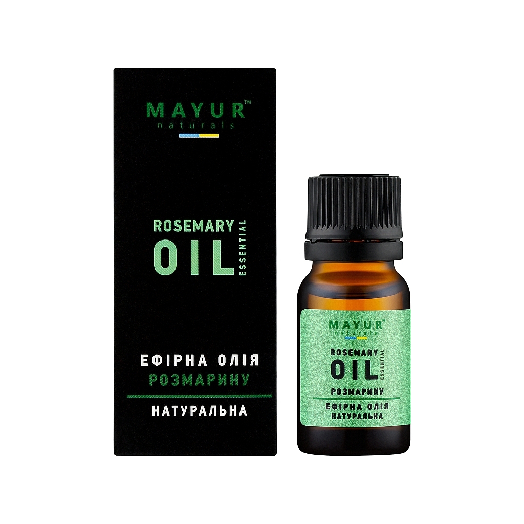 Ефірна олія Mayur Розмарину 10 мл – це натуральний продукт, який має безліч ароматерапевтичних та косметичних властивостей. Ароматерапевтичні властивості: зміцнює імунітет, тонізує, підвищує настрій, бадьорить, усуває втому, покращує пам’ять та посилює чуттєвість. Косметичні властивості: очищає та тонізує проблемну шкіру, звужує пори, регулює роботу сальних залоз, запобігає вугровому висипу, прискорює загоєння ушкоджень шкіри, відбілює та надає омолоджуючу дію.