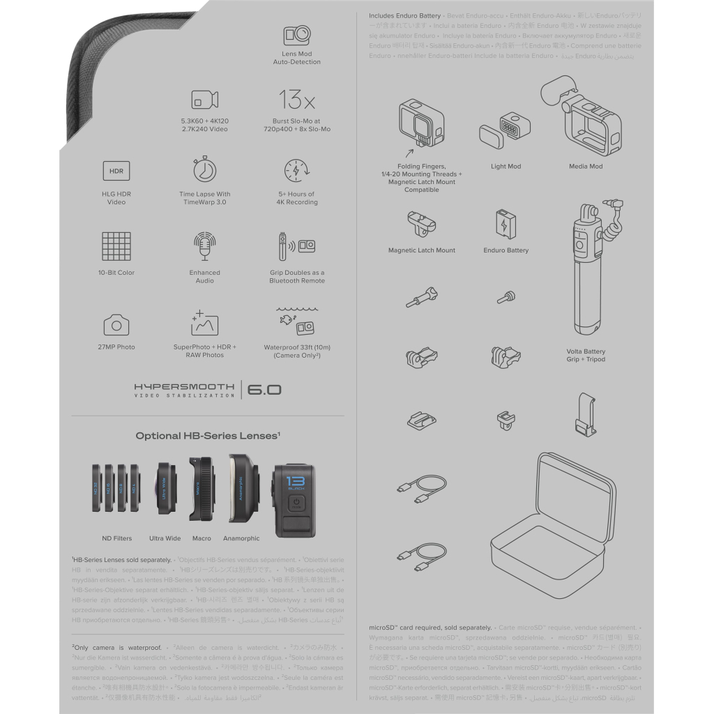 Вам під силу найжорсткіші випробування з HERO13 Black! Камера працює на глибині до 10 метрів, знімаючи у чудовій якості без відблисків та спотворень завдяки вологозахисній кришці об’єктива. Отримайте ще довший час роботи з новим акумулятором Enduro, незалежно від температури надворі. У вашому розпорядженні 2.5 години зйомки в 1080p та 1.5 години зйомки в 5.3К або 4К.