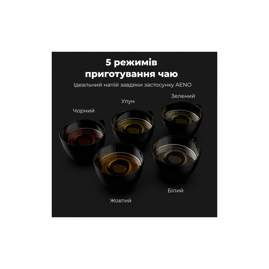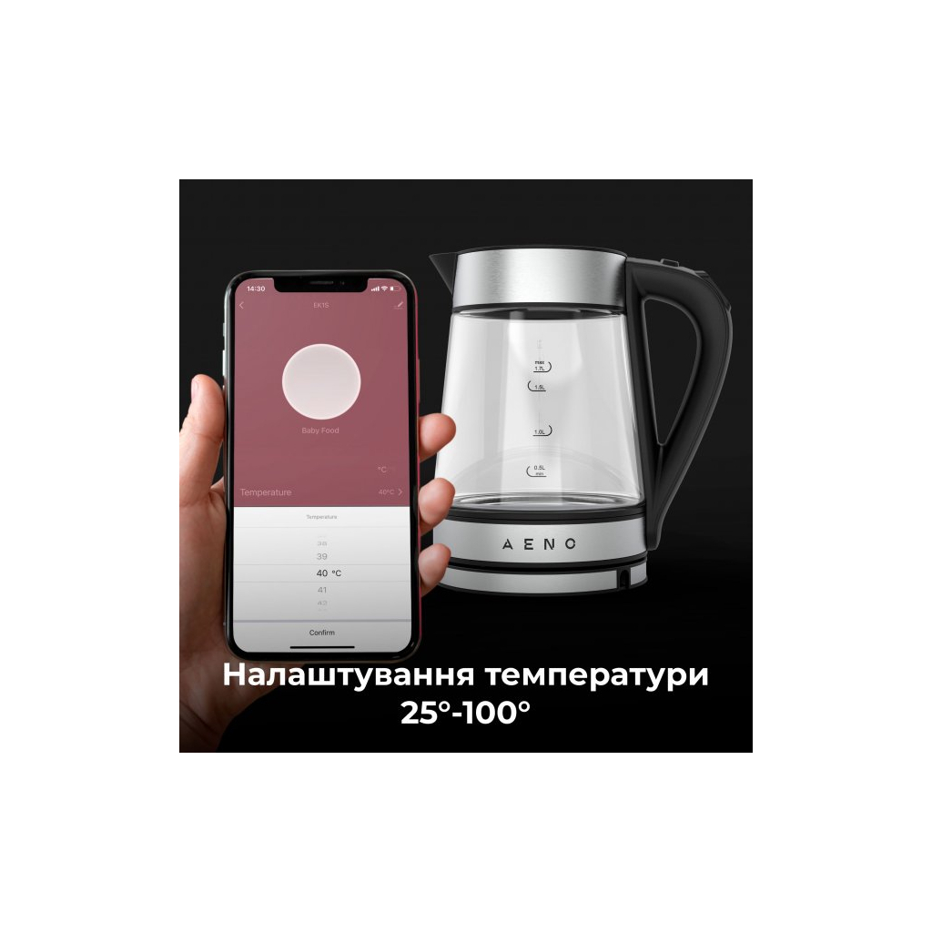 Серед особливостей AENO EK1S варто відзначити Smart-управління з можливістю встановлення температури нагрівання (40°C, 70°C, 80°C, 90°C, 100°C), підсвічування корпусу, звуковий сигнал та відсік для зберігання шнура. Завдяки контролеру STRIX та світловому індикатору, ви завжди будете в курсі процесу нагрівання. Габарити електрочайника складають 24.1 х 15.8 х 22.3 см, а вага – 1.15 кг. Цей стильний електрочайник стане незамінним помічником на вашій кухні.