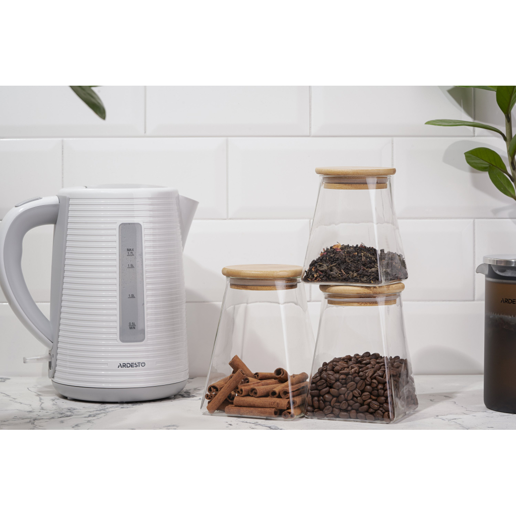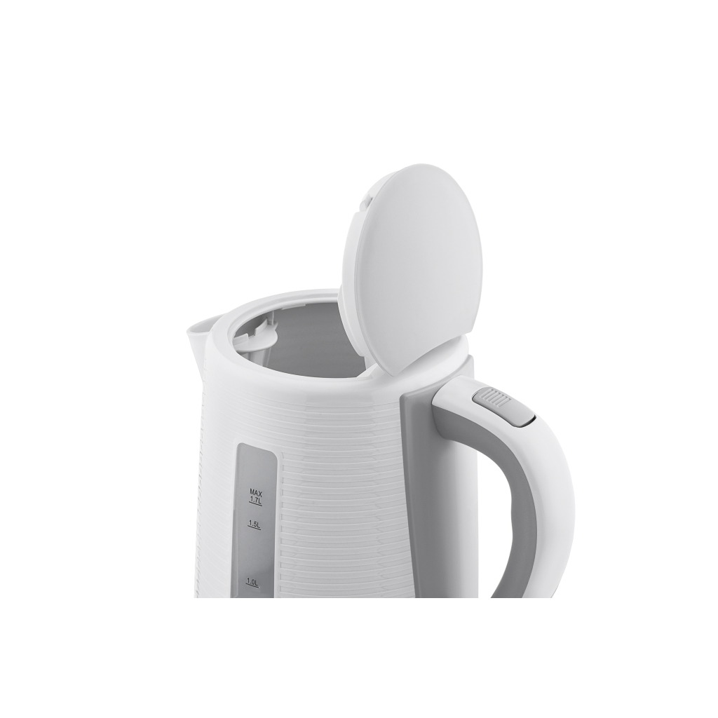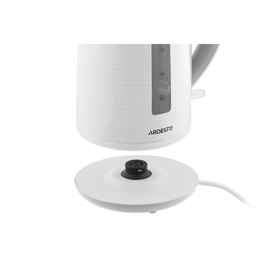 Шкала об’єму має зручні позначки, а для комфортного використання є ручка з кнопкою відкриття кришки. За увімкнення відповідає окрема клавіша, розташована в нижній частині чайника. Довжина проводу підставки становить 80 см.