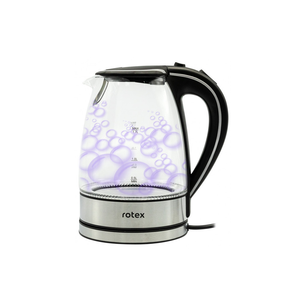Електрочайник Rotex RKT82-G дозволить закип’ятити воду за лічені секунди! Цей потужний електрочайник (2200 Вт) ємністю 1.7 л має прихований нагрівальний елемент з нержавіючої сталі, а також вбудований знімний фільтр, який легко знімається і миється. Ви завжди отримаєте кришталево чисту воду без частинок накипу. Корпус виготовлений з високоміцного скла, яке є екологічно чистим матеріалом. Завдяки градуюванні, яке нанесена на поверхні чайника, Ви зможете закип’ятити необхідний обсяг води.