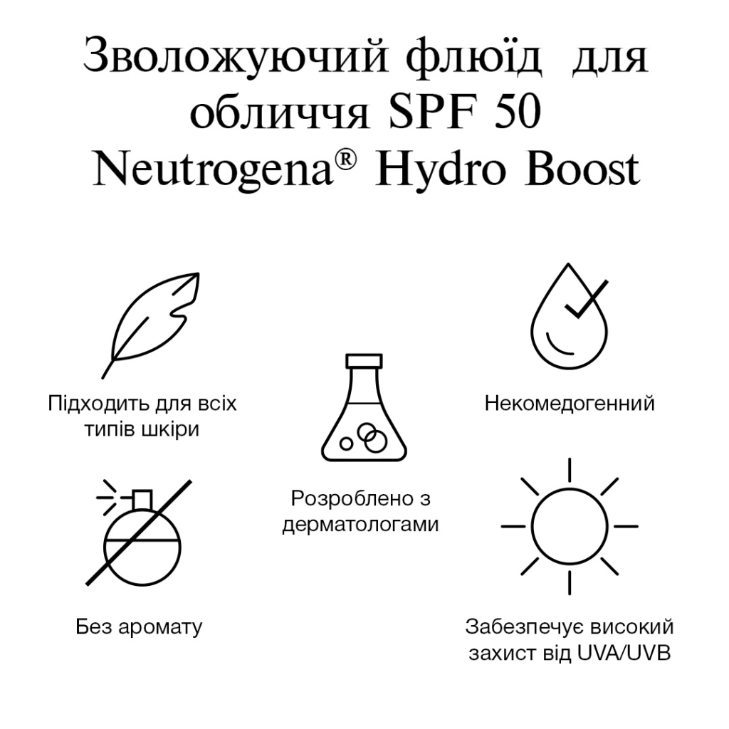 Забезпечте своїй шкірі надійний захист від сонця та інтенсивне зволоження з легким флюїдом NEUTROGENA® Hydro Boost®. Цей флюїд пропонує високий захист від променів UVA/UVB та довгохвильового UVA, а також глибоке зволоження, зберігаючи бар’єр шкіри. Основні характеристики: