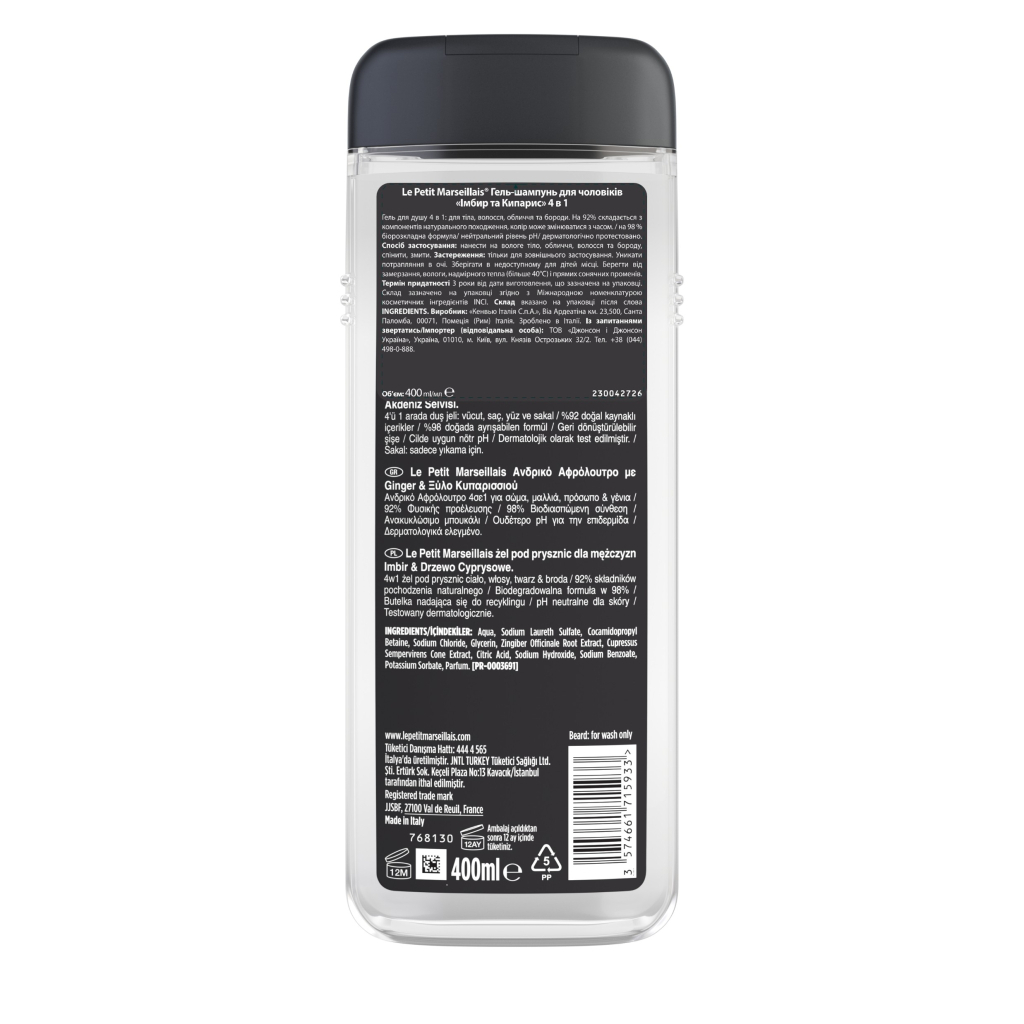 Гель для душу Le Petit Marseillais 4 в 1 Імбир і кипарисове дерево – це універсальний засіб для очищення, зволоження та освіження шкіри. Ідеально підходить для всіх типів шкіри, цей гель стане вашим надійним помічником у щоденній гігієні.