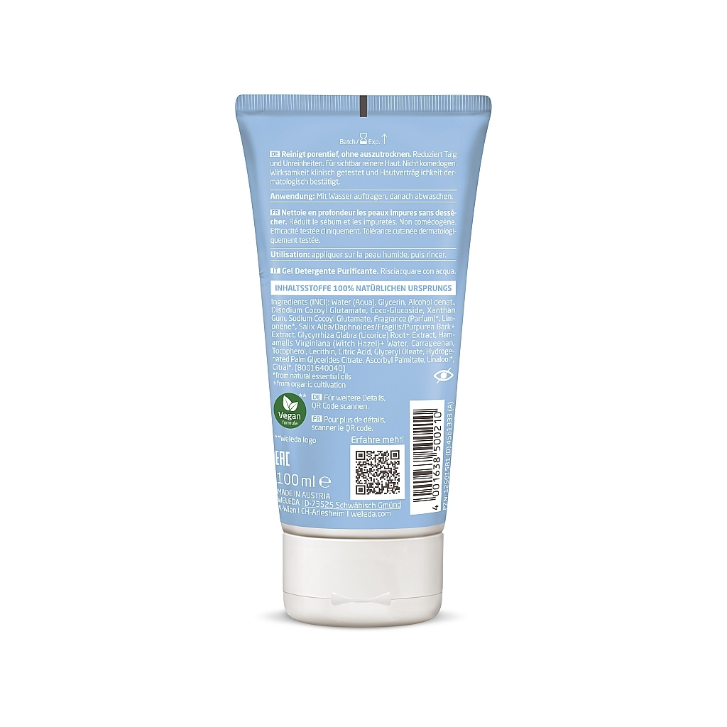 Гель для вмивання Weleda – ідеальний засіб для жирної, комбінованої й проблемної шкіри. Його основне призначення полягає в очищенні шкіри, звуженні пор, матуванні та боротьбі з запаленнями. Об'єм 100 мл забезпечує тривалий використання, а натуральна формула робить його безпечним для щоденного застосування.