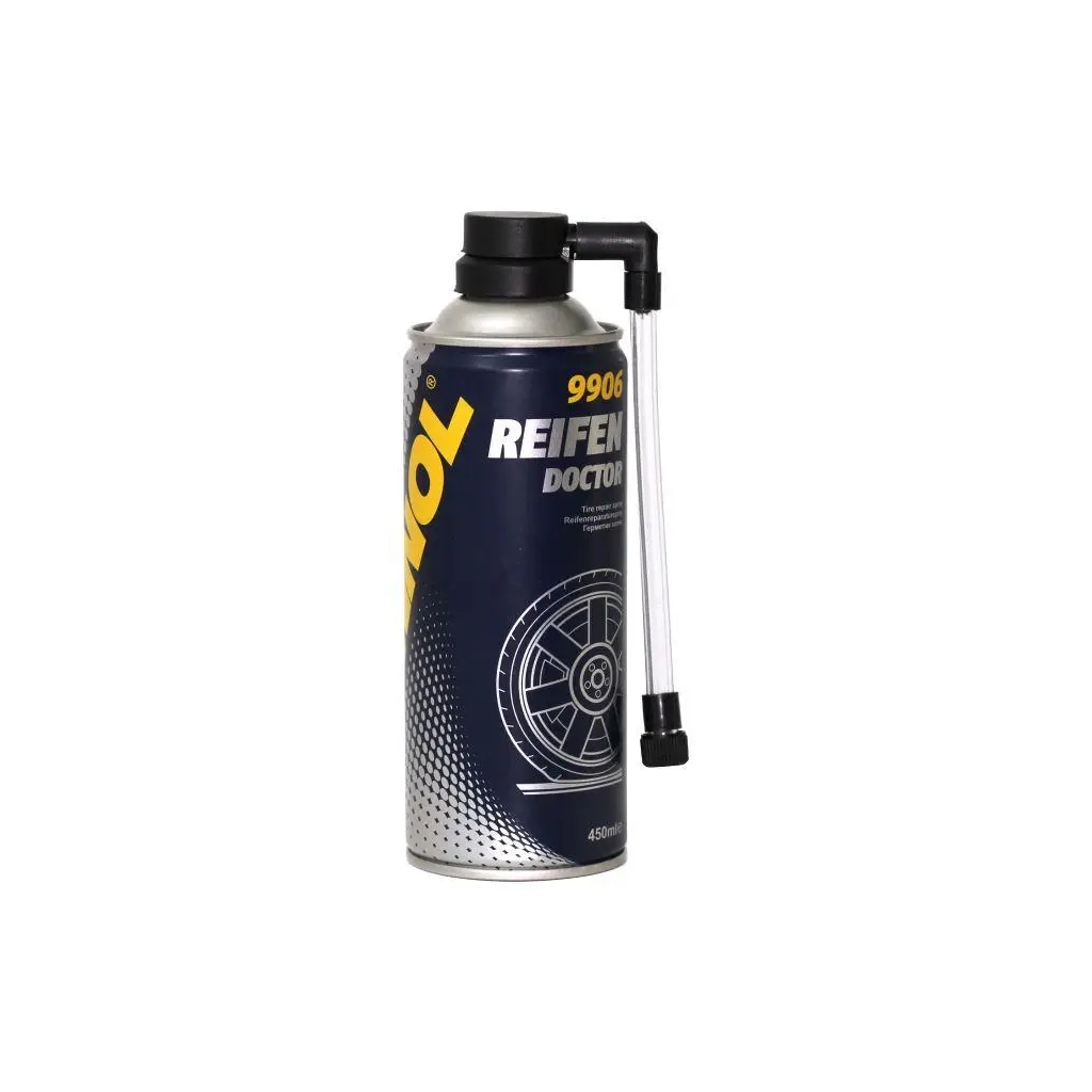 Mannol Reifen Doctor призначений для ремонту проколів покришок усіх типів без їхнього демонтажу. Надійно та швидко усуває витікання повітря за діаметр проколу до 5 мм за допомогою створення довговічної вулканізувальної плівки. Цей продукт не впливає на балансування коліс, залишається в колесі в активному стані тривалий час і перешкоджає виникненню витоків повітря надалі.
