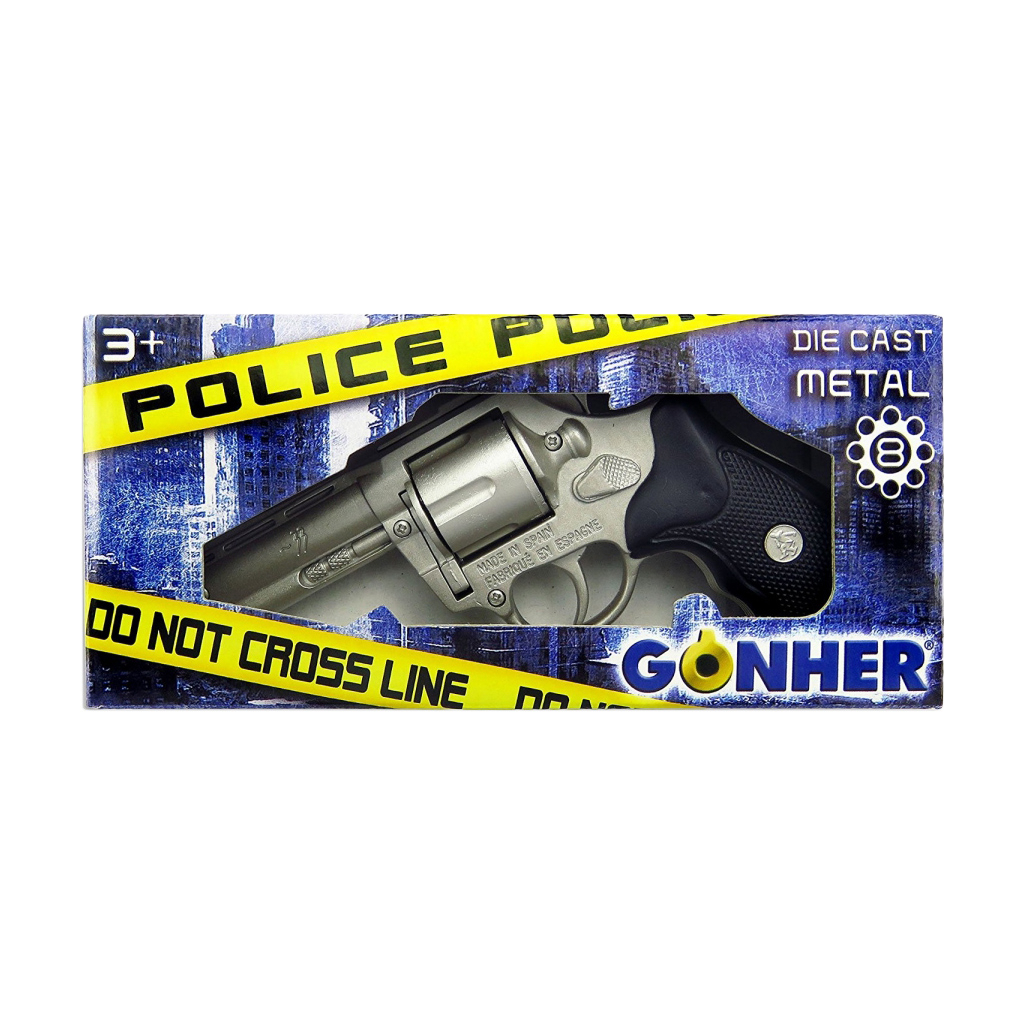 Основні технічні характеристики: виробник – Gonher, модель – Револьвер поліцейський 8-зарядний, тип боєприпасів – пістони (які купуються окремо), розміри – 19 х 8.5 х 3.5 см, колір – сріблястий, країна виробництва – Іспанія.