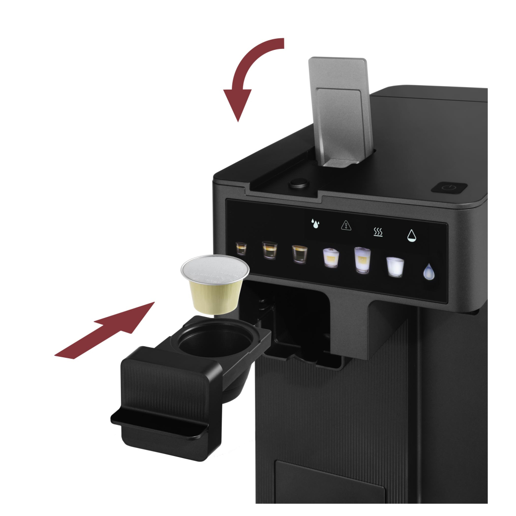 Серед особливостей кавоварки – автоматичний капучинатор, що дозволяє готувати напої з молоком без зайвих зусиль, а також три розміри чашки та три адаптери для більшості звичайних кавових капсул. Завдяки перехіднику для меленої кави, ви зможете експериментувати з різними сортами кави. Кавоварка також має функції автоматичного промивання, вибору об'єму порції та індикації роботи, що робить її використання ще більш зручним.