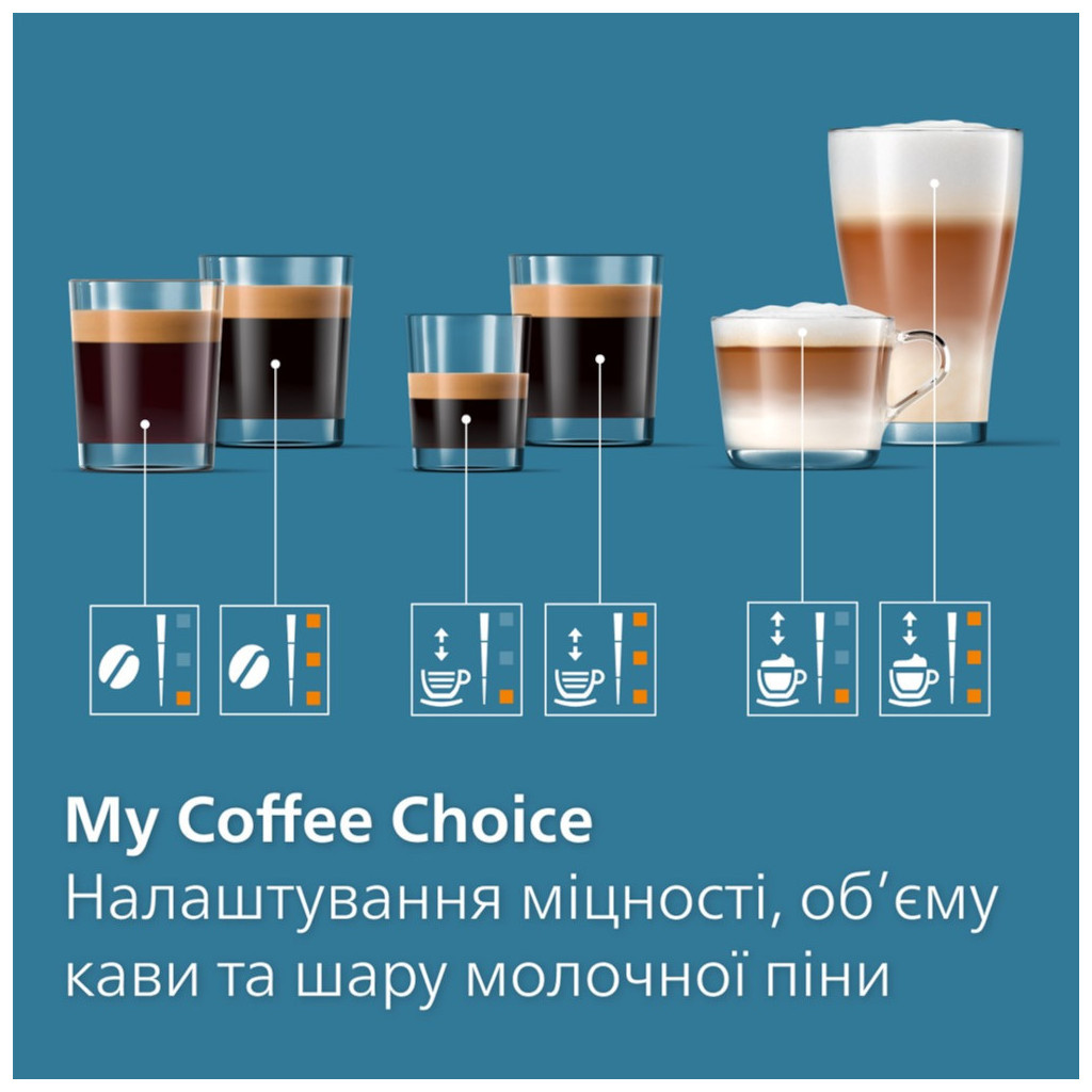Легко обирайте улюблені напої завдяки сучасному сенсорному дисплею з кольоровими піктограмами. Приготуйте каву, яку ви любите, за допомогою меню My Coffee Choice: виберіть бажану міцність, об’єм напою і шар молочної пінки на свій смак.