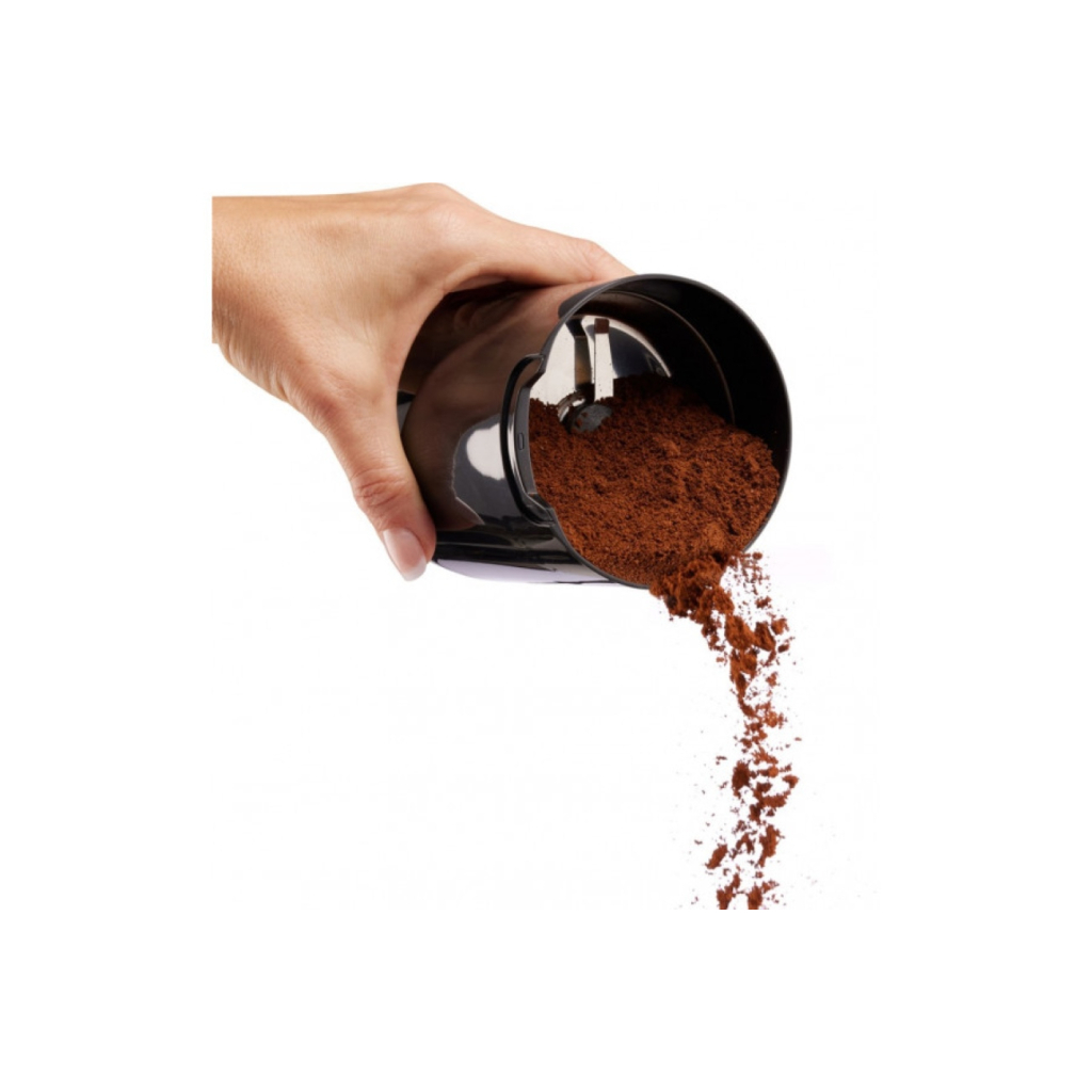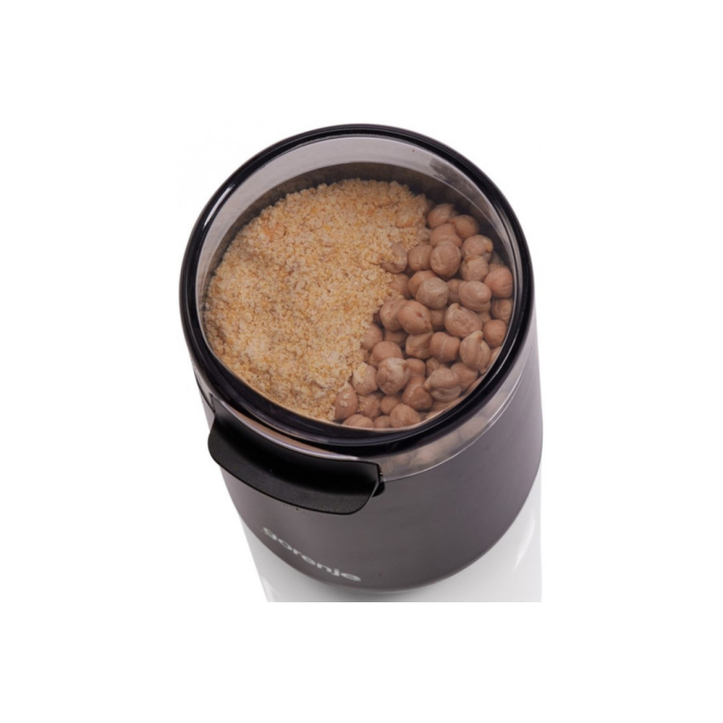 Кавомолка Gorenje SMK150SB – це високоякісний пристрій для подрібнення різноманітних продуктів, оснащений ножем з ротаційним механізмом. З потужністю 150 Вт вона ефективно подрібнює горіхи, зелену каву, зернові, крупи, спеції, трави та цукор. Завдяки імпульсному режиму, автоблокуванню та захисту від перегріву, кавомолка гарантує безпечне та стабільне використання. Вона має знімний контейнер, що полегшує очищення та використання, а також металеві жорна, які забезпечують довговічність та високу якість подрібнення. Чаша кавомолки та лезо виготовлені з нержавіючої сталі, що додає міцності та стійкості до корозії. Для зручності зберігання шнура передбачено спеціальне відділення, а гумові ніжки забезпечують стабільність під час роботи.