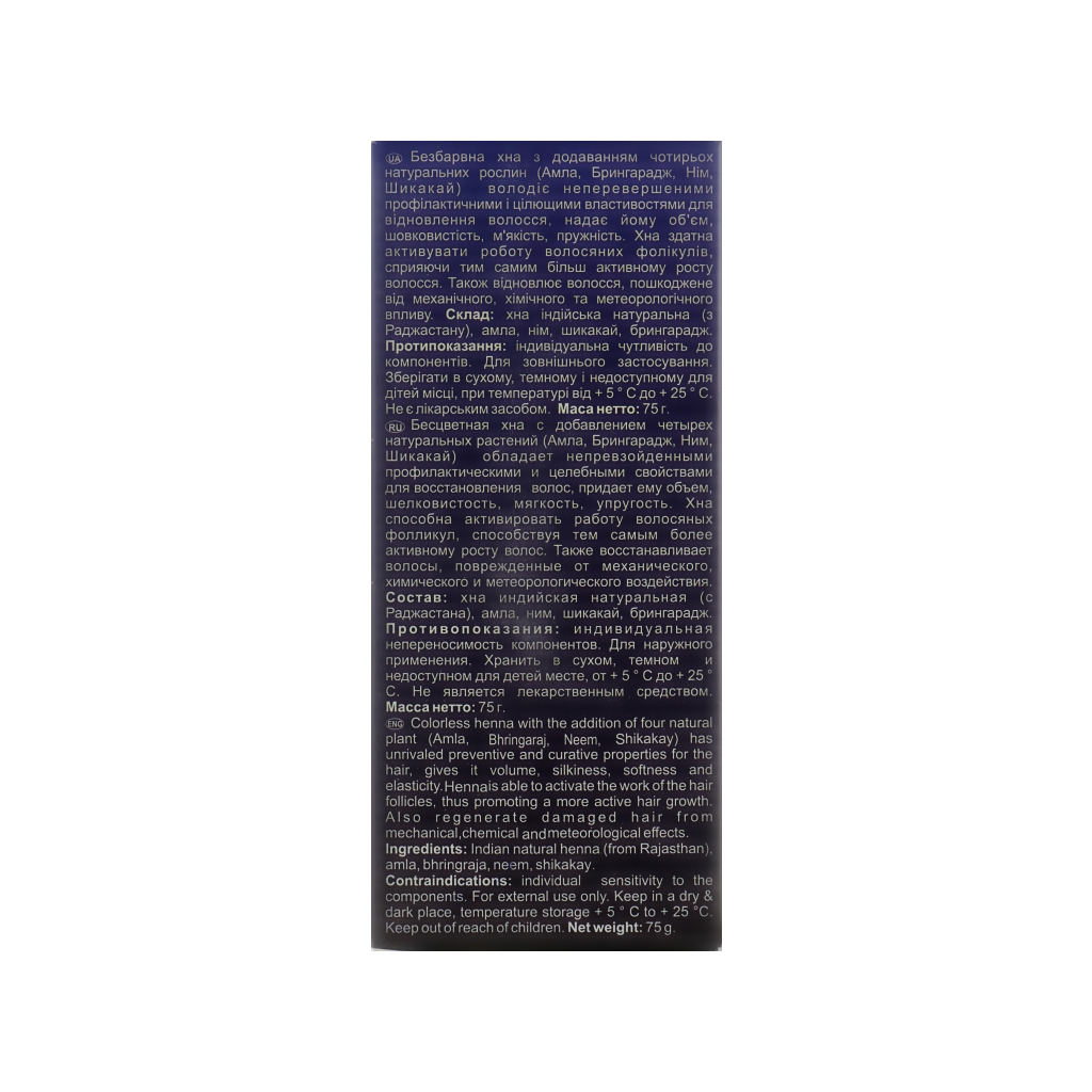 Хна Triuga Аюрведична безбарвна 100 г – це натуральний засіб для догляду за волоссям, який не тільки покращує їхній стан, але й не фарбує. Завдяки унікальному складу, до якого входять хна індійська, амла, брингарадж, ним та шикакай, ви отримуєте натуральний догляд без шкоди для кольору волосся.