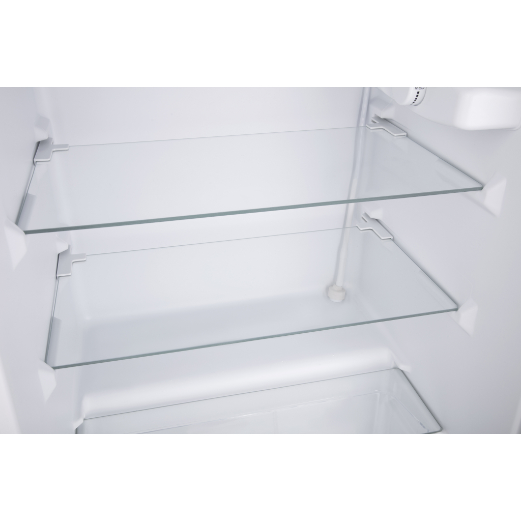 Основні технічні характеристики включають: корисний об'єм холодильної камери – 84 л, корисний об'єм морозильної камери – 9 л, висота – 85 см, ширина – 47.2 см, глибина – 45 см, а також рівень шуму – 42 дБ. Холодильник оснащений трьома полицями з загартованого скла, контейнером для овочів та полицею для пляшок, що робить його зручним у використанні.