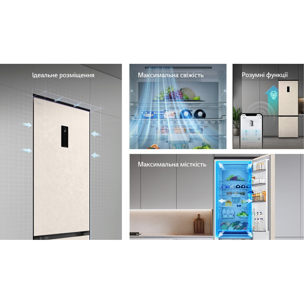 Холодильник LG GC-B509EEKM з нижньою морозильною камерою має загальний корисний об’єм 375 л, з яких 262 л займає холодильне відділення, а 113 л – морозильне. Цей пристрій оснащений інверторним компресором, що забезпечує ефективну роботу та низький рівень шуму, всього 35 дБ. Завдяки системі Total No Frost, вам не потрібно турбуватися про обмерзання. Технологія DoorCooling+ забезпечує рівномірне охолодження всередині холодильника, а зовнішній LED-дисплей дозволяє зручно контролювати налаштування.