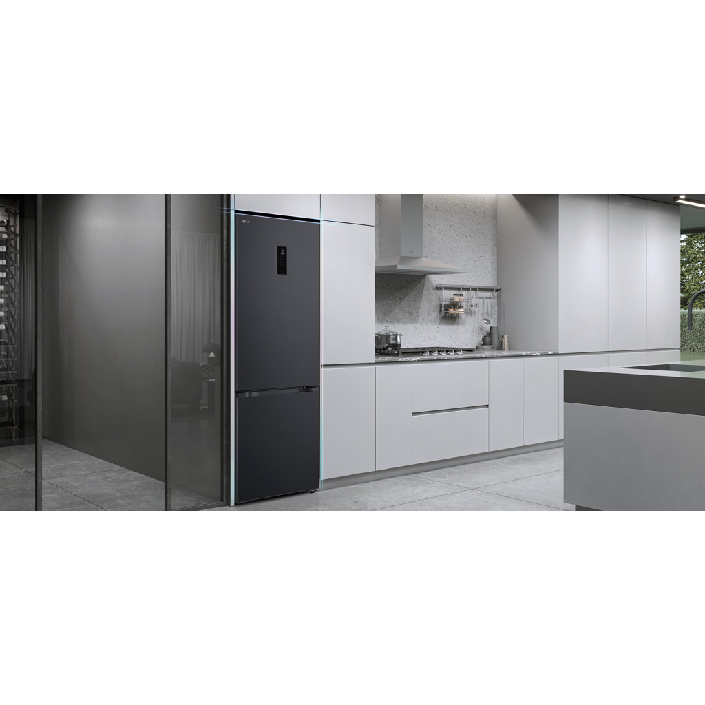 Холодильник LG GC-B509ETLM з нижньою морозильною камерою має загальний корисний об’єм 375 л (262 л холодильне відділення + 113 л морозильне). Пристрій оснащений інверторним компресором, системою Total No Frost, технологією DoorCooling+ та зовнішнім LED-дисплеєм. Зона свіжості Fresh Zone підтримує оптимальні умови для тривалого зберігання продуктів. Річне споживання енергії становить 263 кВт·год (клас E), рівень шуму – 35 дБ.