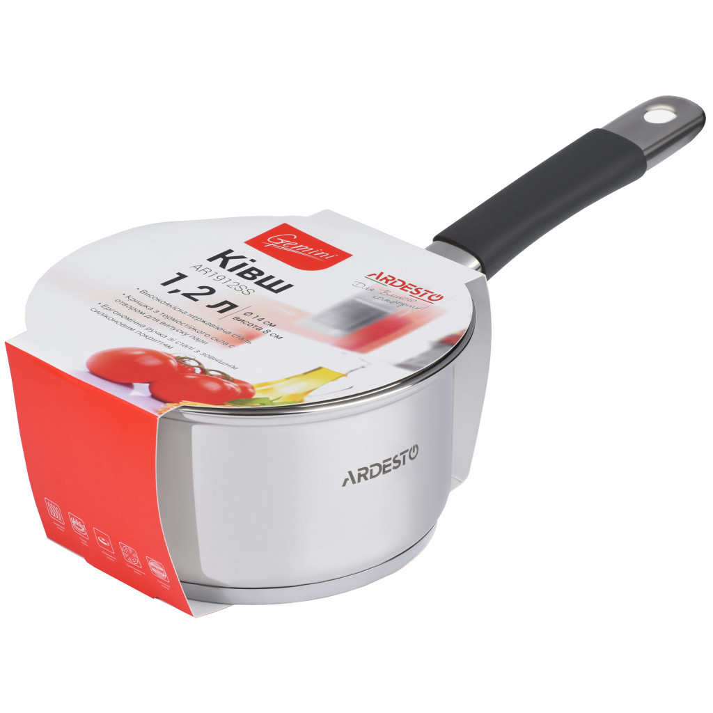 Ківш Ardesto Gemini 1.2 л (AR1912SS) – це ідеальний помічник на вашій кухні, що поєднує в собі стильний дизайн та високу функціональність. Завдяки об'єму 1.2 літра та круглій формі, цей ківш підходить для приготування різноманітних страв, від соусів до супів.