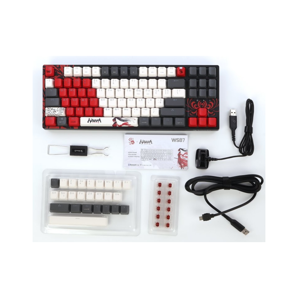 A4Tech Bloody WS87 Naraka Wireless/Bluetooth Black/Red – це ігрова механічна клавіатура, яка забезпечує бездротове підключення через USB та Bluetooth. Ідеально підходить для використання з телевізором, вона має компактний дизайн та стильне RGB підсвічування, що робить її чудовим вибором для геймерів.