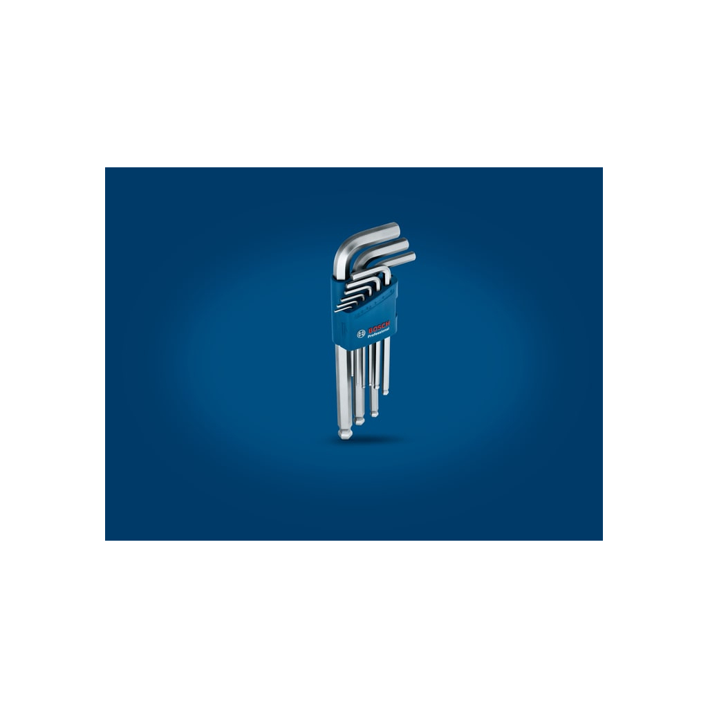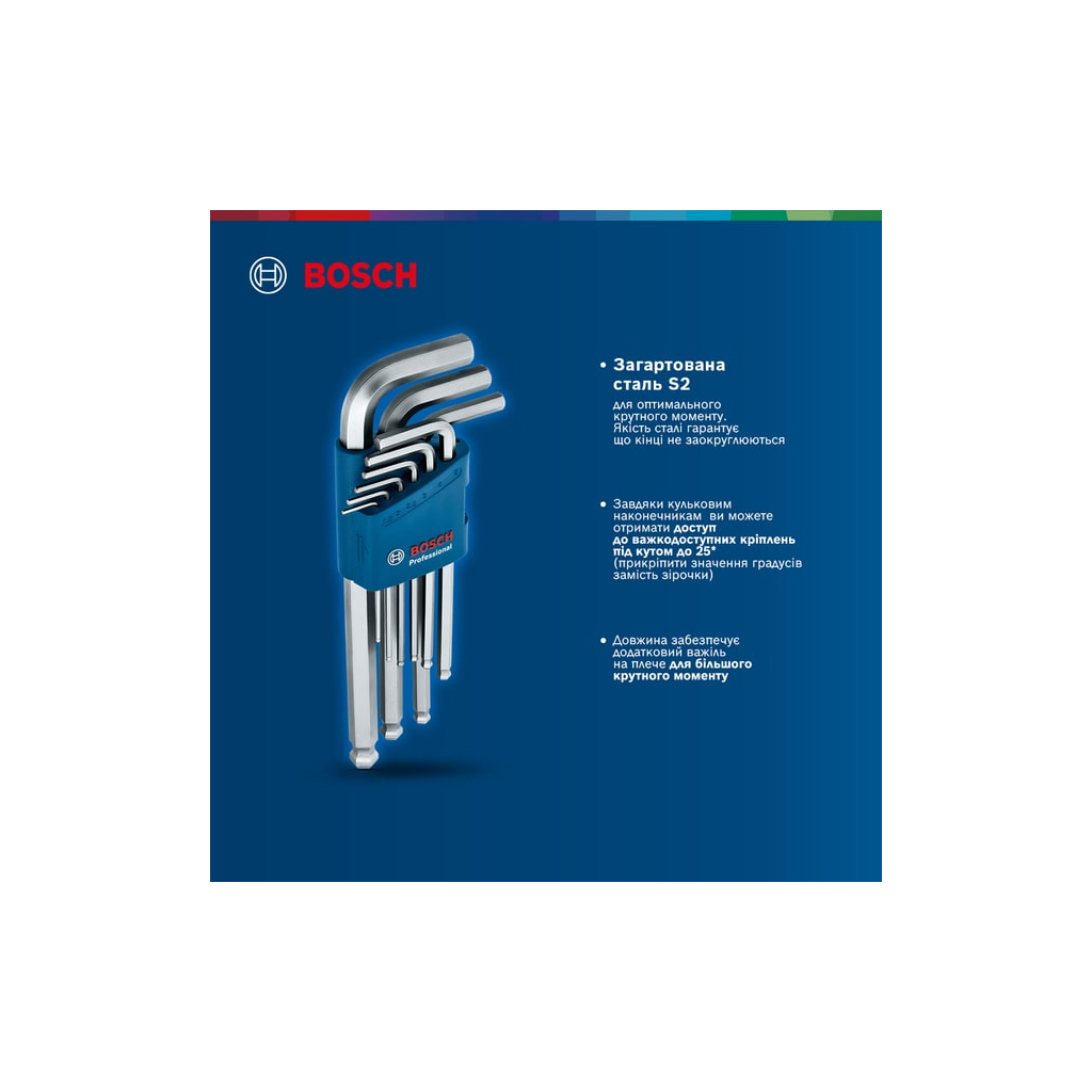 Ключ Bosch шестигранний, набір 9шт, кулястий наконечник (1.600.A01.TH5) – це незамінний інструмент для кожного майстра. Загартований вал із загартованої сталі S2 не зношується і гарантує оптимальний крутний момент протягом тривалого часу. Кулькові головки дозволяють легко працювати у важкодоступних місцях, що робить цей набір ідеальним для різноманітних завдань. Зручна довжина шестигранного ключа забезпечує додатковий важіль для більшого крутного моменту, що спрощує закручування і відкручування шестигранних болтів. Набір містить 9 шестигранних ключів розміром: