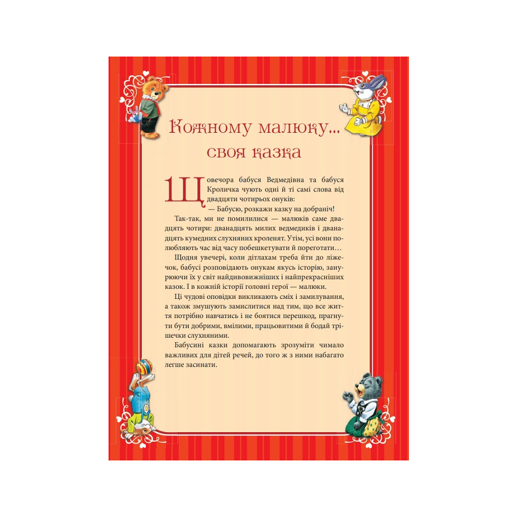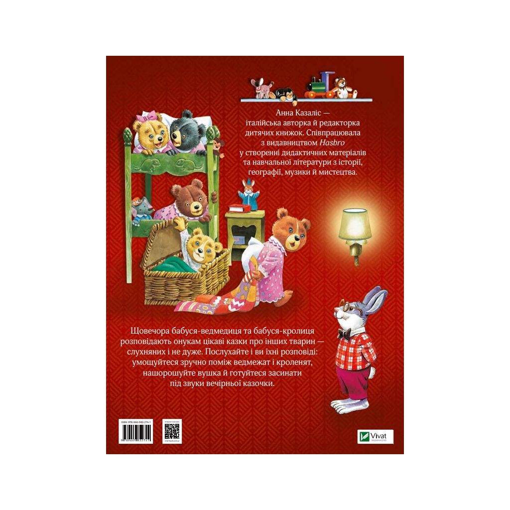 Книга Бабусині казки на добраніч від Анни Казаліс – це чудовий вибір для маленьких слухачів. Щовечора бабуся-ведмедиця та бабуся-кролиця розповідають своїм онукам цікаві казки про інших тварин. Ці оповідки не лише викликають сміх і замилування, але й спонукають дітей замислитися над важливими життєвими уроками. Вони навчають бути добрими, працьовитими та вмілими, а також не боятися перешкод. Послухайте ці захоплюючі історії, зручно влаштувавшись серед ведмежат і кроленят, і готуйтеся засинати під звуки вечірньої казочки.