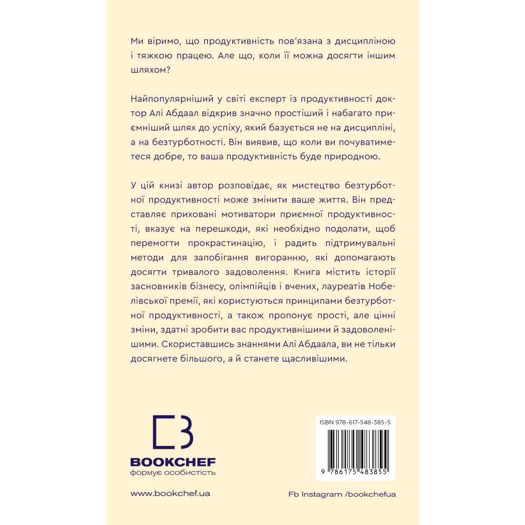 Ми стандартно вважаємо, що продуктивність залежить від тяжкої праці й суворої дисципліни. Що шлях до успіху встелений нескінченними розчаруваннями й подоланням труднощів. Але якщо є інший спосіб? Найпопулярніший у світі експерт із продуктивності доктор Алі Абдаал відкрив значно простіший і набагато приємніший шлях до успіху, який базується не на дисципліні, а на безтурботності. Він виявив, що коли ви почуватиметеся добре, то ваша продуктивність буде природною. У цій книзі автор розповідає, як мистецтво безтурботної продуктивності може змінити ваше життя. Він представляє приховані мотиватори приємної продуктивності, вказує на перешкоди, які необхідно подолати,