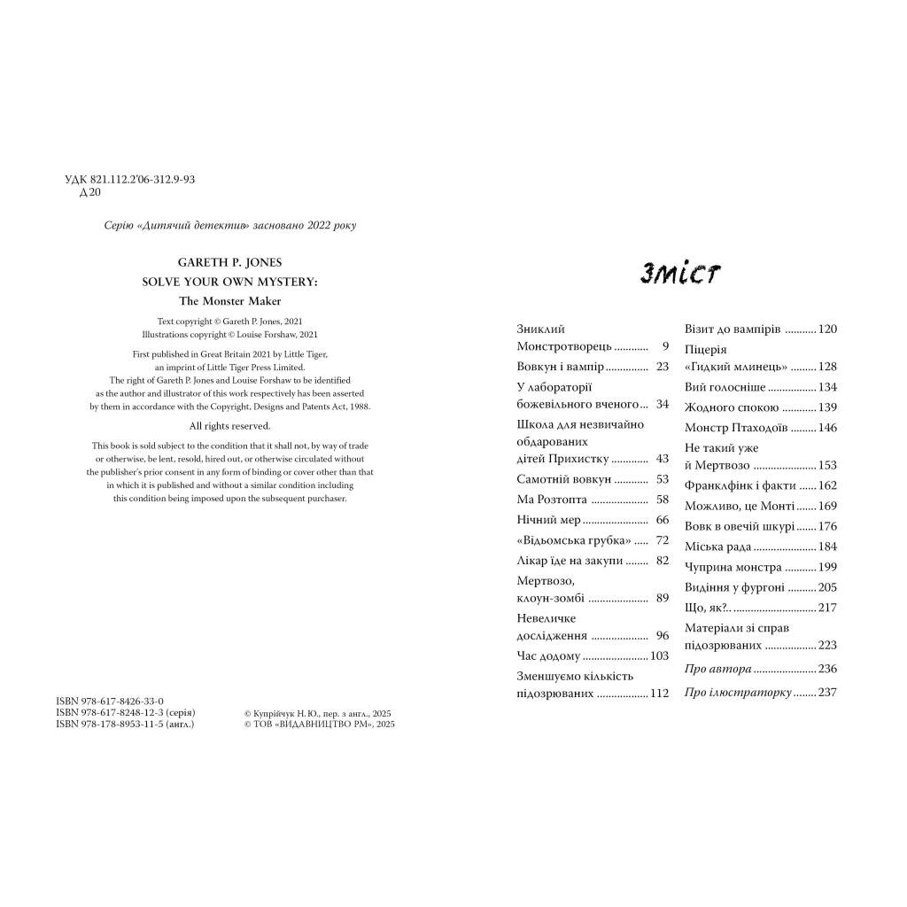 Книга Розгадай таємницю самостійно. Монстротворець. Книга 1 від Ґарета Ф. Джонса – це захоплююча детективна історія, яка перенесе вас у світ загадок та пригод. У цій книзі ви станете детективом разом із єті Клаусом Зольстаґом, щоб розкрити таємницю зникнення Монстротворця лікаря Франклфінка. Чи зможете ви знайти винного? Підозрювані – жахливий вампір Бремвел Стокер, двоє шкідливих близнюків-гобліненят, хитрі відьми та навіть Монті, синочок-монстрик лікаря. Вирішувати лише вам! Ця книга стане чудовим подарунком для дітей віком від 6 до 12 років, адже вона не лише розвиває логічне мислення, а й дарує незабутні емоції.