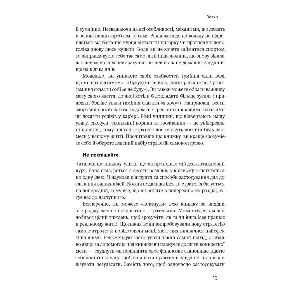 Книга «Сила волі. Шлях до влади над собою» відомої американської психологині Келлі Макґоніґал стала світовим бестселером. У цій книзі авторка поєднала наукові факти про функціонування нашого мозку з практичними вправами, які допоможуть розвинути силу волі. Келлі Макґоніґал допомогла тисячам людей змінити своє життя: кинути шкідливі звички, зайнятися спортом, створити бізнес та налагодити стосунки. Книга містить безліч цікавих прикладів і вправ, які дозволяють натренувати мозок, як м’язи. Для кого ця книга? Вона стане в нагоді тим, хто прагне досягти своїх цілей, але стикається з браком сили волі. Чому варто прочитати? Основою книги став курс «Наука сили волі», який викладає авторка в Стенфордському університеті. Ви дізнаєтеся, чому в стресових ситуаціях ми часто відмовляємося від своїх планів.