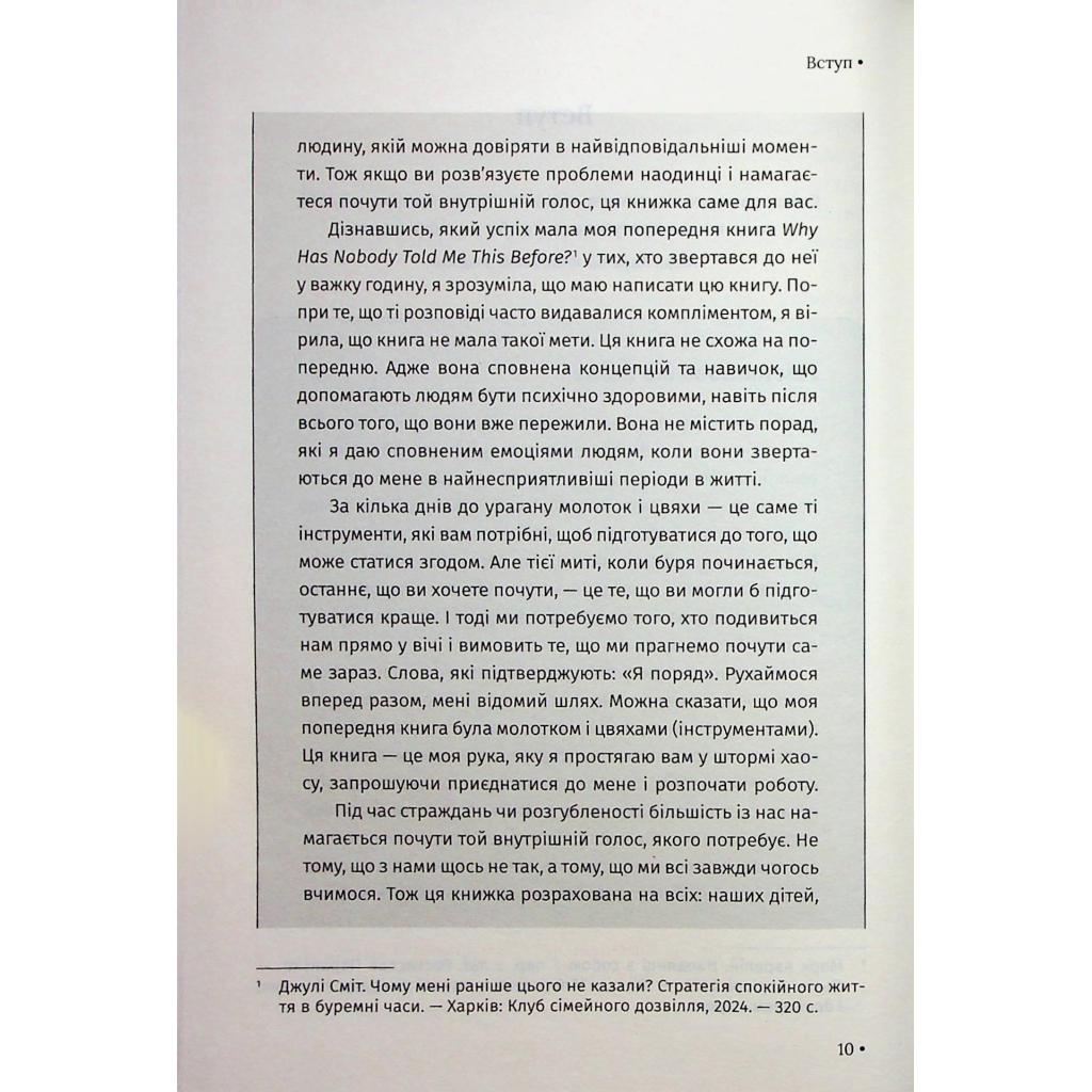Книга Відкрийте цю книжку, коли… авторства Джулі Сміт – це ідеальне продовження бестселера “Чому мені раніше цього не казали?”, що допоміг зміцнити психічне здоров’я тисячам людей. У цій книзі авторка розглядає моменти, коли ви опиняєтеся в епіцентрі емоційного шторму. Кожен розділ присвячений окремій життєвій ситуації, знайомій багатьом. У формі стилізованих листів докторка Сміт звертається до читача, коли здається, що все виходить з-під контролю через тривогу та сумніви. Вона надає практичні поради та техніки, які допоможуть знайти опору і зробити перший крок до спокою. “Відкрийте цю книжку, коли…” – це голос підтримки, коли ви найбільше її потребуєте.