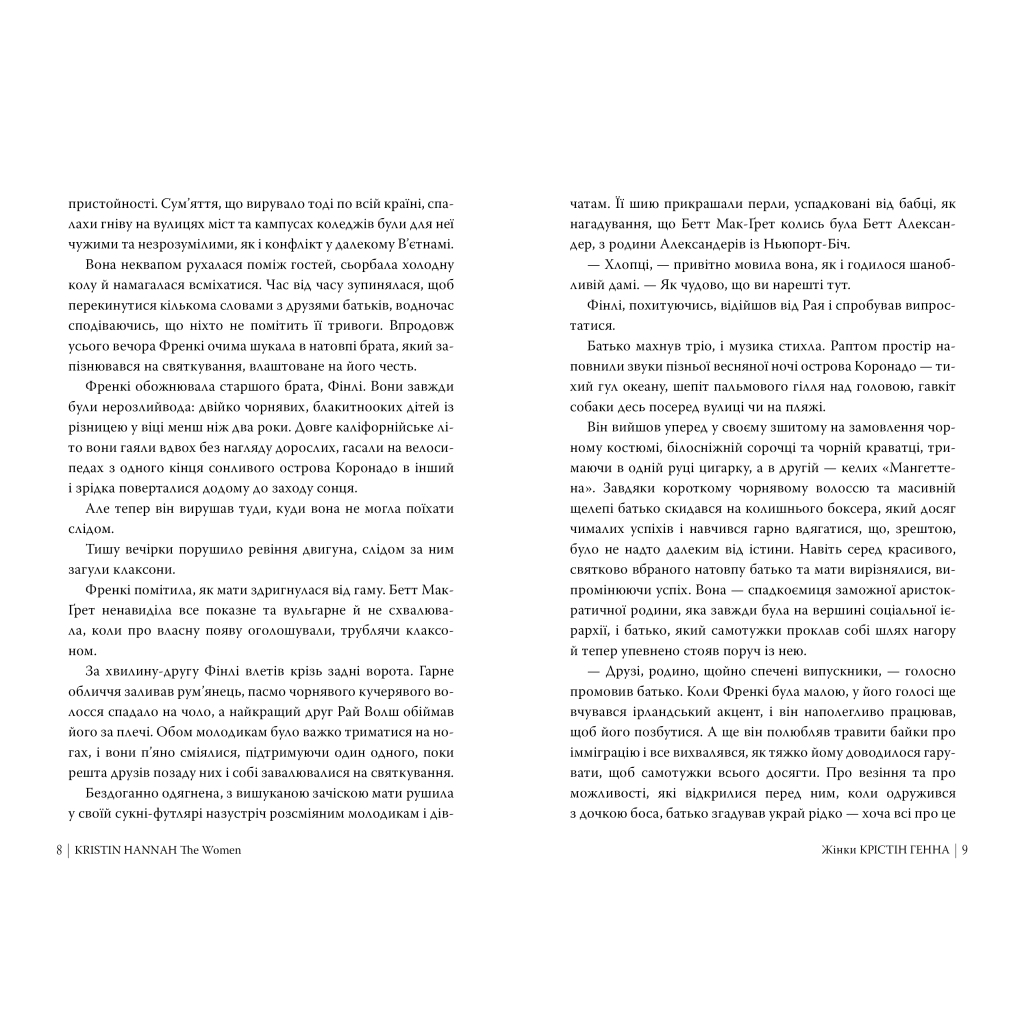 Книга Жінки – Крістін Генна від Видавництва РМ – це захоплюючий роман, що розкриває історію молодої жінки, яка намагається знайти своє місце у світі, сповненому змін. Френсіс Мак-Ґрет, двадцятирічна студентка коледжу, стикається з викликами, які ставить перед нею життя під час війни у В’єтнамі. Вихована в консервативній родині, вона завжди дотримувалася правил, але з початком 1965 року її світогляд починає змінюватися. Вступивши до Корпусу медсестер армії США, Френкі стає свідком жахіть війни, де кожен день – це боротьба за виживання. Цей роман не лише про війну, а й про дружбу, жертви та відданість, які часто залишаються непоміченими. Крістін Генна майстерно передає емоції та переживання героїні, створюючи глибокий і зворушливий наратив.