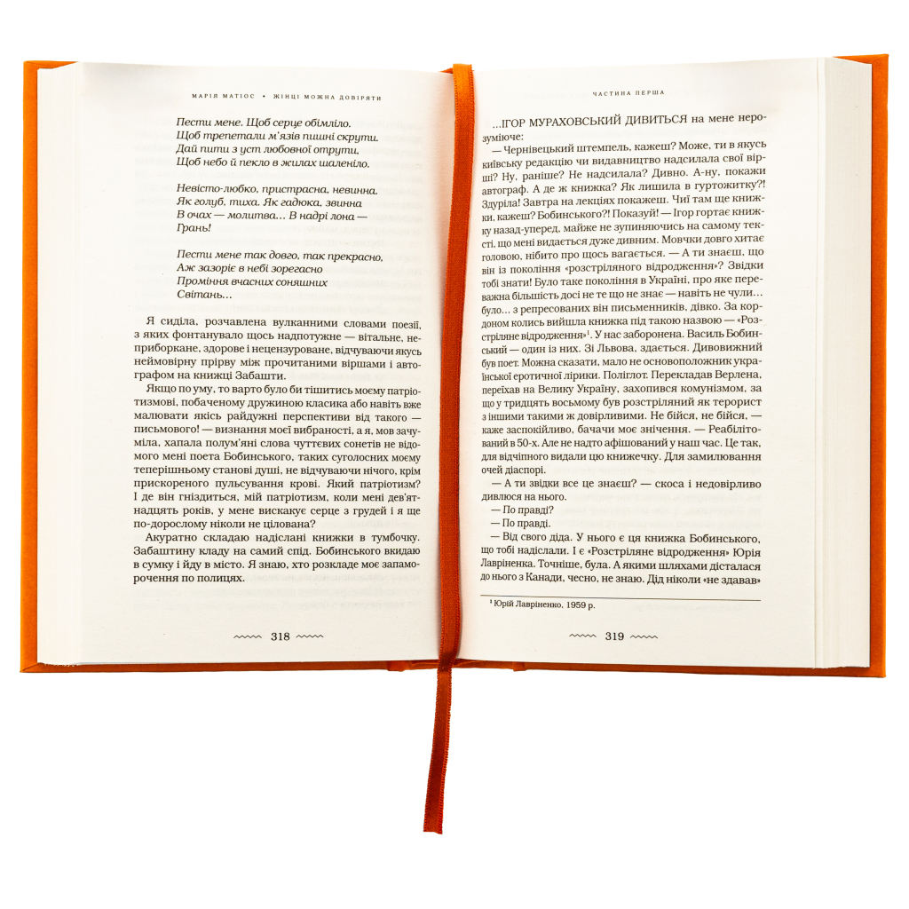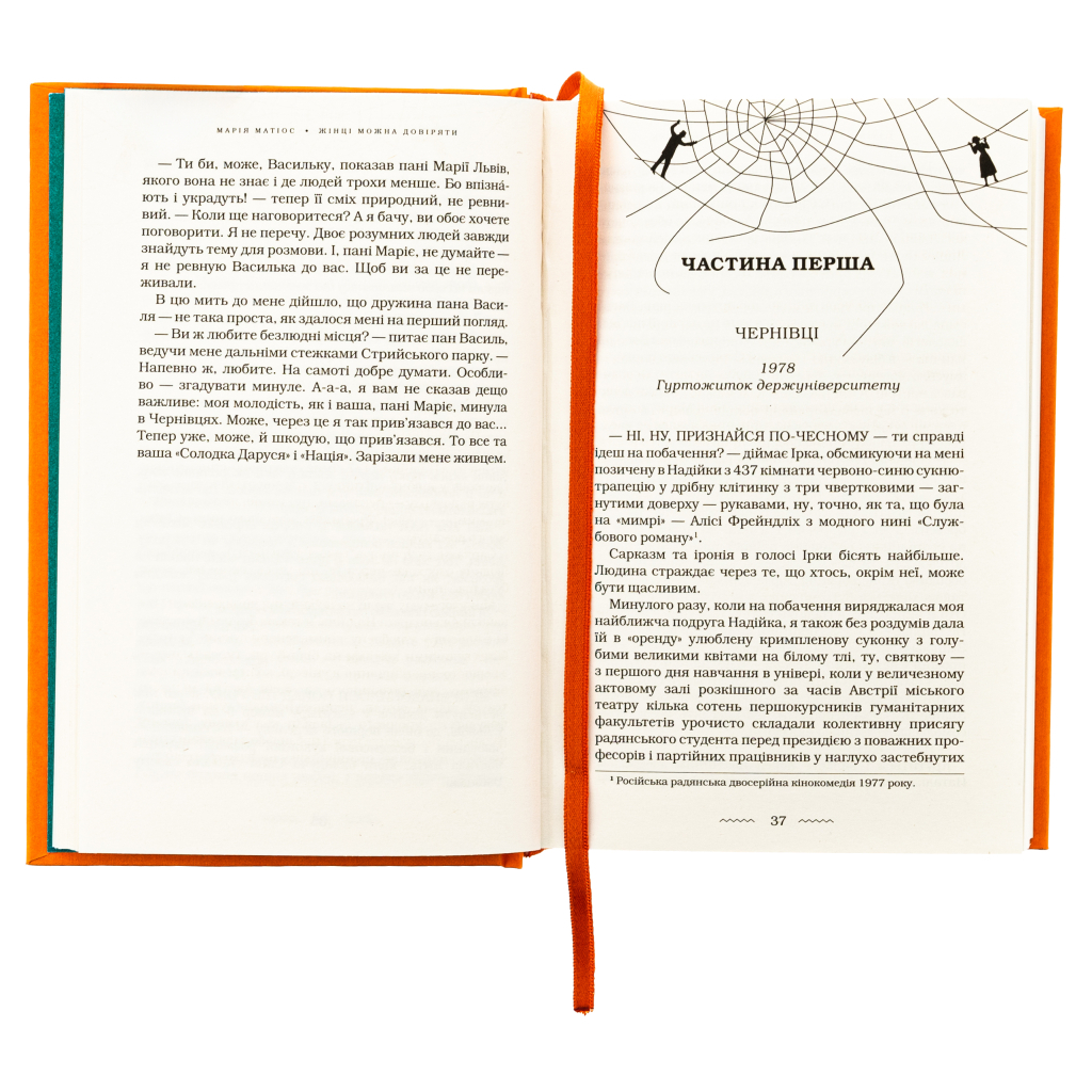 У новому романі «Жінці можна довіряти» відомої української письменниці Марії Матіос розкривається складна і неоднозначна природа пам’яті та минулого. Ключі від теперішнього завжди припадають пилом у минулому. Але чи готові ми відкрити комори своєї пам’яті, де замкнено зраду, підступ і брехню? Як часто наші вчинки в минулому впливають на життя рідних? Цей роман є точним маркером епохи 70-90-х років ХХ століття, відображаючи тотальну ідеологічну цензуру, шантаж і підступи КҐБ. «Жінці можна довіряти» — це не просто художня література, це глибоке дослідження людської природи, яке змушує задуматися про наслідки наших дій.