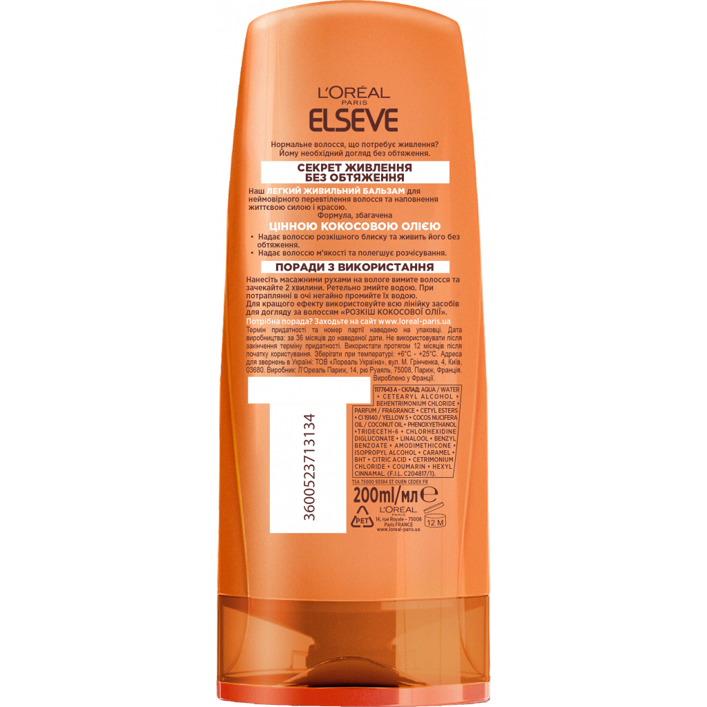 Кондиціонер для волосся Elseve Розкіш кокосової олії 200 мл – це легкий поживний бальзам, який забезпечує неймовірне перевтілення волосся, наповнюючи його життєвою силою та красою. Формула, збагачена дорогоцінною кокосовою олією, надає волоссю розкішний блиск і живить його без обважнення. Не містить силіконів, що забезпечує природність під час торкання волосся.