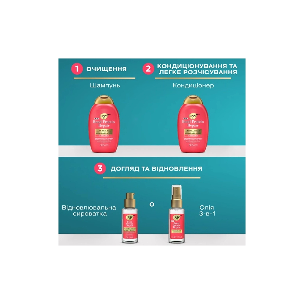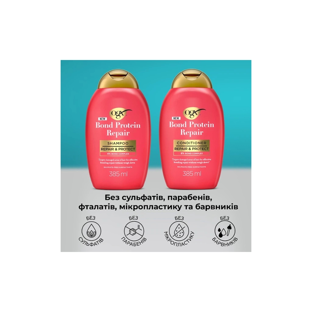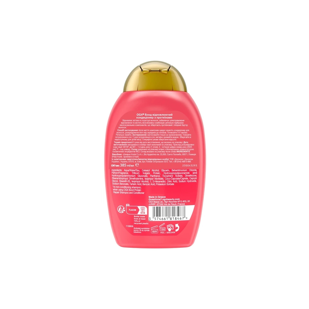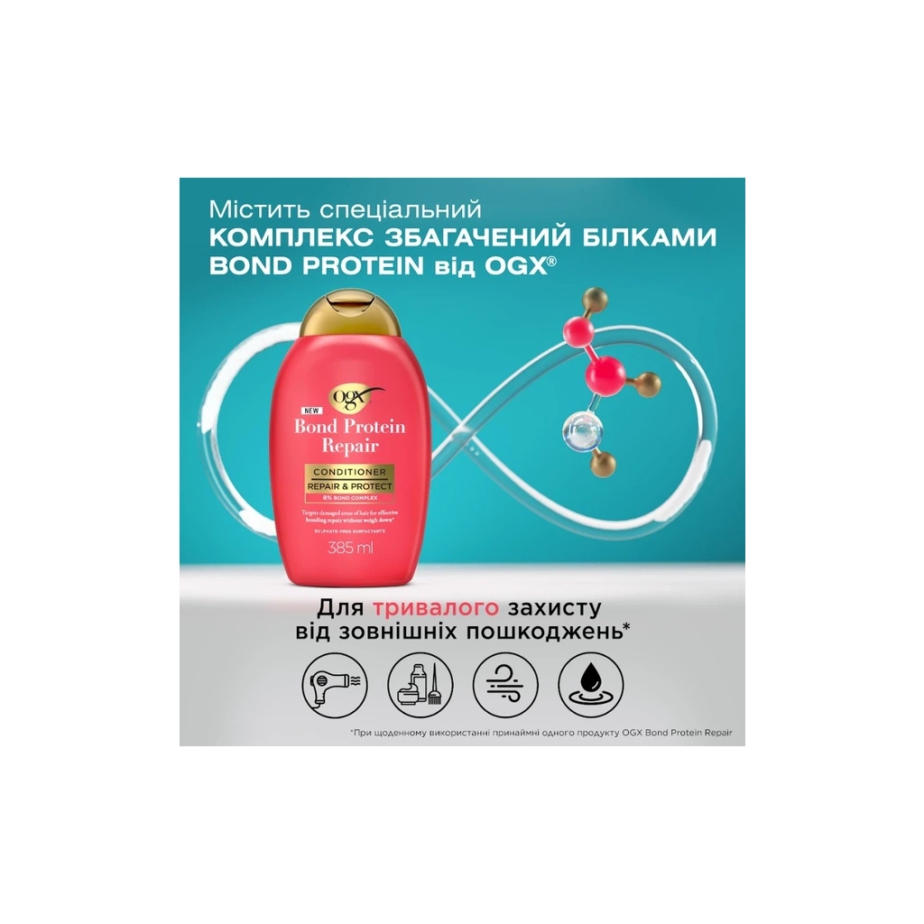 Кондиціонер для волосся OGX Bond Protein Repair відновлює та захищає ваше сухе і пошкоджене волосся. Цей легкий кондиціонер з протеїнами спеціально розроблений для цілеспрямованого відновлення пошкоджених ділянок волосся, не обтяжуючи його. Завдяки технології Lipi Pro Shield, кондиціонер допомагає зберегти протеїновий і ліпідний бар’єр волосся, роблячи його здоровим і сильним.