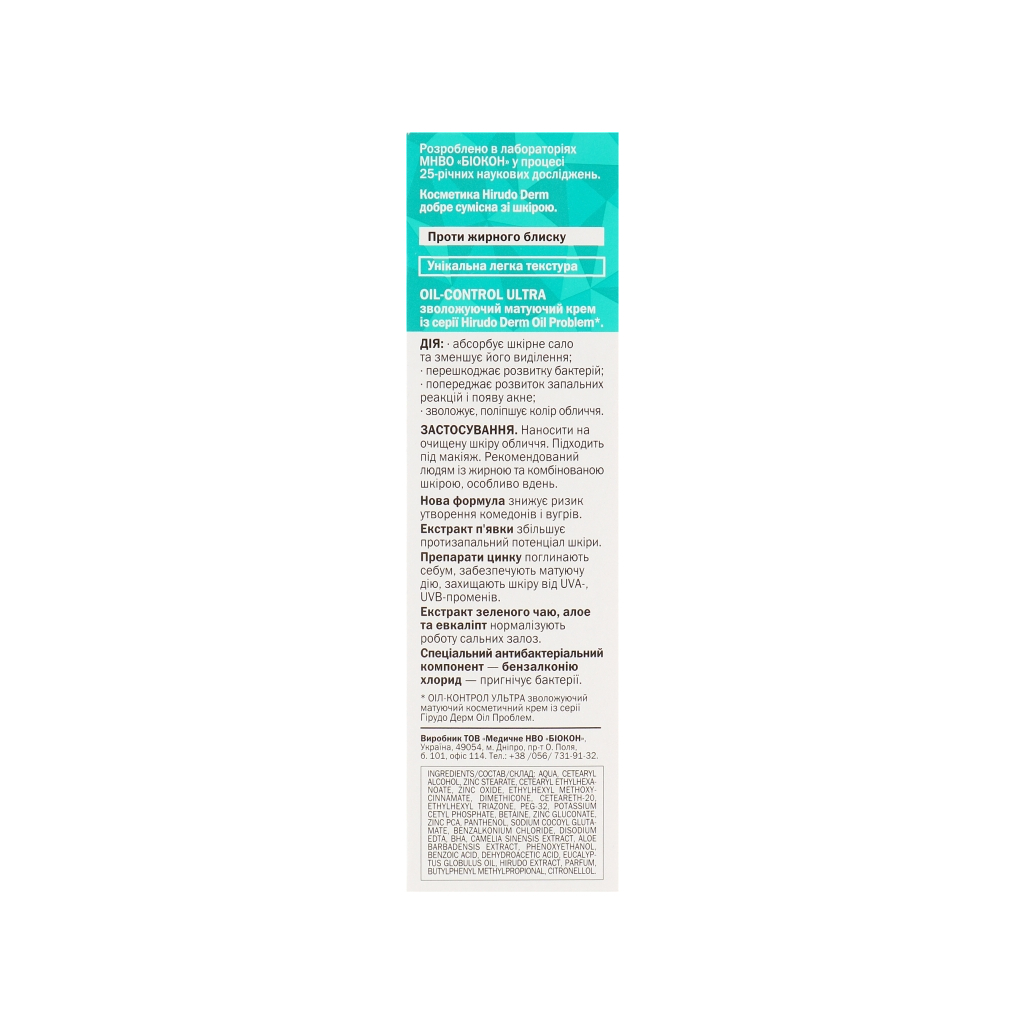 Біокон Hirudo Derm Oil Problem Oil-Control Ultra – це зволожувальний матувальний крем для обличчя об'ємом 50 мл, спеціально розроблений для проблемної та жирної шкіри. Призначений для жінок від 16 років, цей крем допомагає контролювати надмірне виділення шкірного жиру, забезпечуючи при цьому глибоке зволоження.
