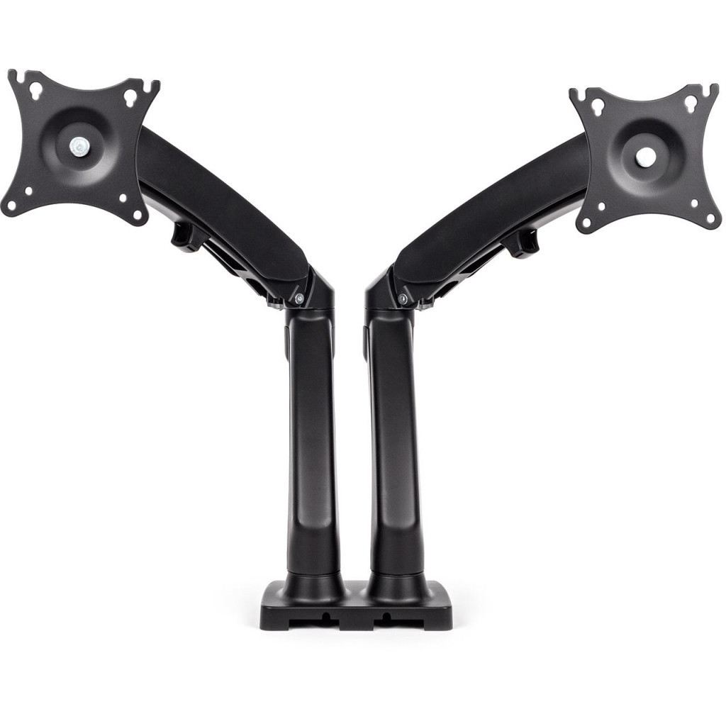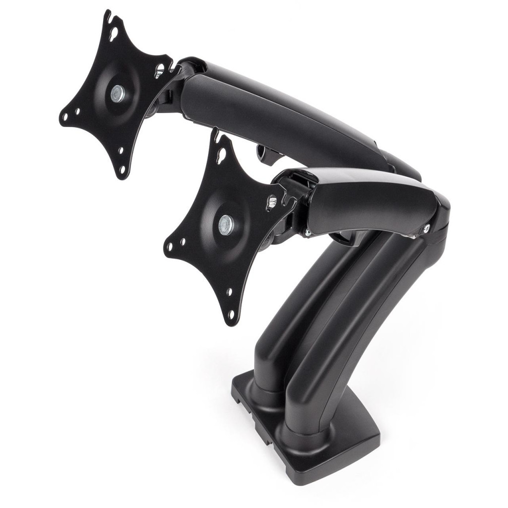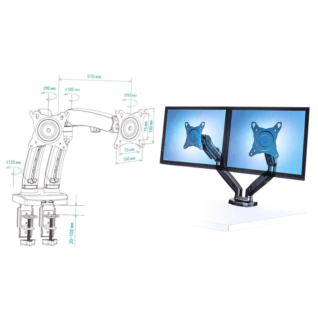 Основні технічні характеристики включають підтримку діагоналей від 10" до 27", що робить його універсальним для більшості моніторів. Кронштейн має 4 ступені свободи, VESA кріплення 75 x 75 та 100 x 100, а також витримує максимальне навантаження до 9 кг. Нахил на 15° дозволяє налаштувати кут огляду для зручності використання.