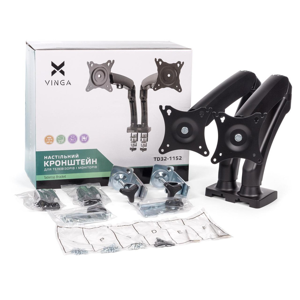 Кронштейн виготовлений з металу, що забезпечує надійність та довговічність. У комплекті ви знайдете інструкцію та елементи кріплення для легкого монтажу. Чорний колір додає естетичного вигляду вашому робочому простору. Вибираючи Vinga TD32-1152, ви отримуєте якісний продукт, що підвищить комфорт вашої роботи та організує простір.