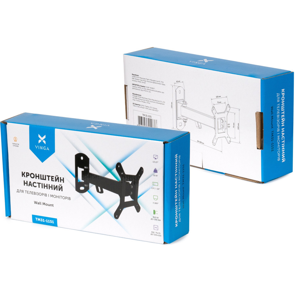 Кронштейн Vinga TM31-1151 легко встановлюється на стіну і постачається з усіма необхідними елементами кріплення та інструкцією. Його металевий корпус забезпечує високу міцність та довговічність. Завдяки можливості регулювання кута нахилу та повороту, ви зможете знайти оптимальне положення для перегляду, що підвищить комфорт під час роботи або відпочинку.