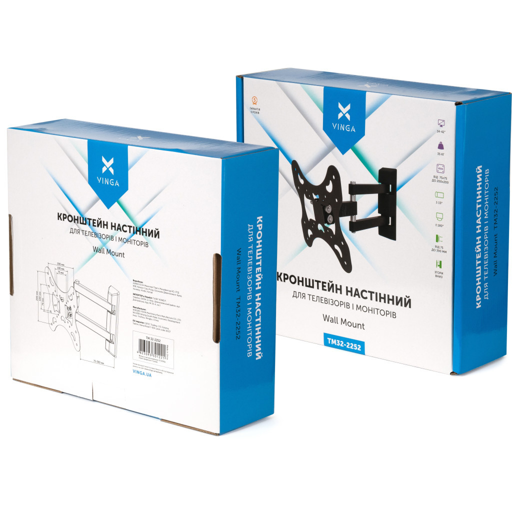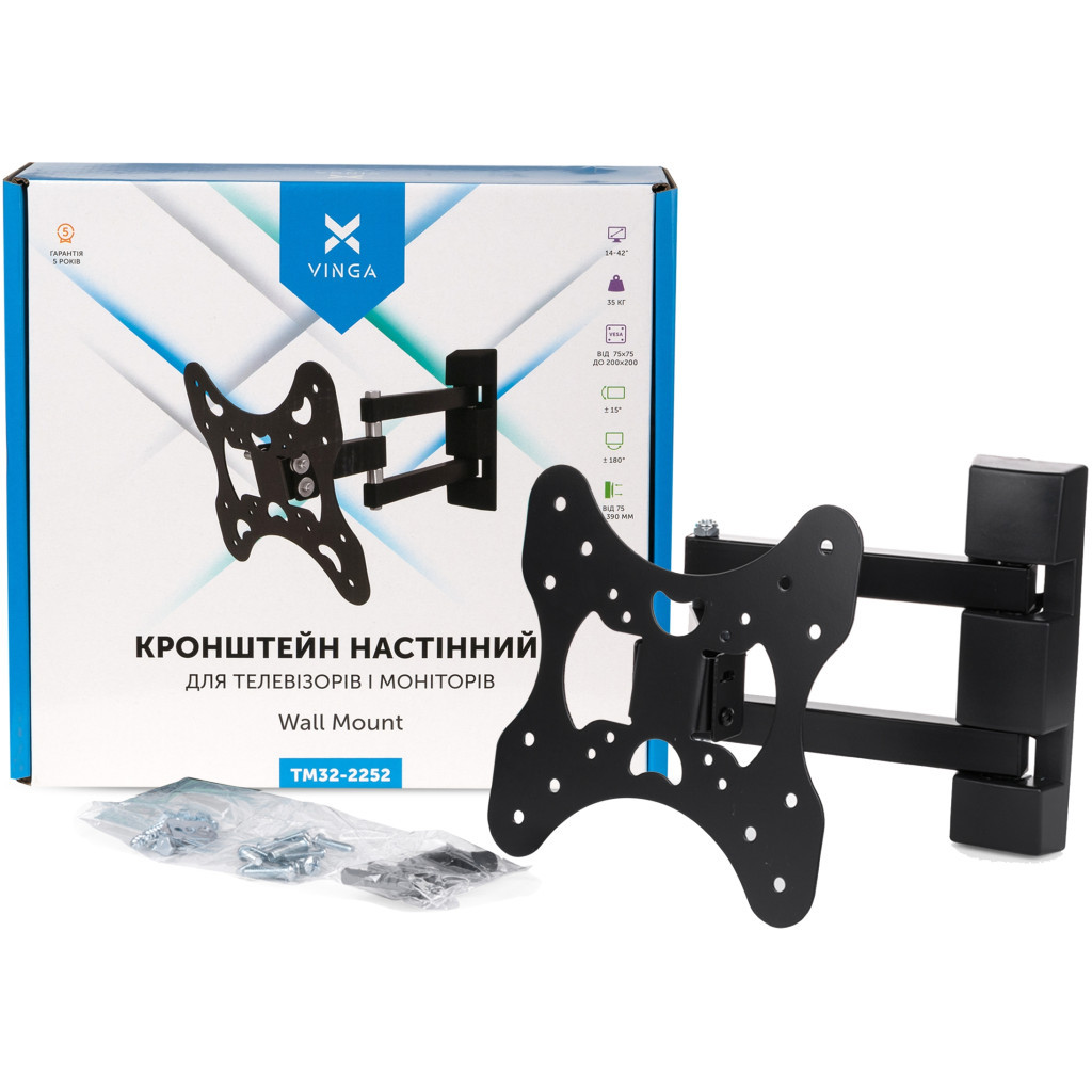 Основні технічні характеристики Vinga TM32-2252 включають: мінімальна підтримувана діагональ – 14", максимальна підтримувана діагональ – 42", VESA – 50 x 50, 75 x 75, 100 x 100, 200 x 100, 200 x 200. Кронштейн має три ступені свободи, що забезпечує легкість у налаштуванні положення екрана. Відстань до стіни варіюється від 75 до 390 мм, що дозволяє оптимально використовувати простір.